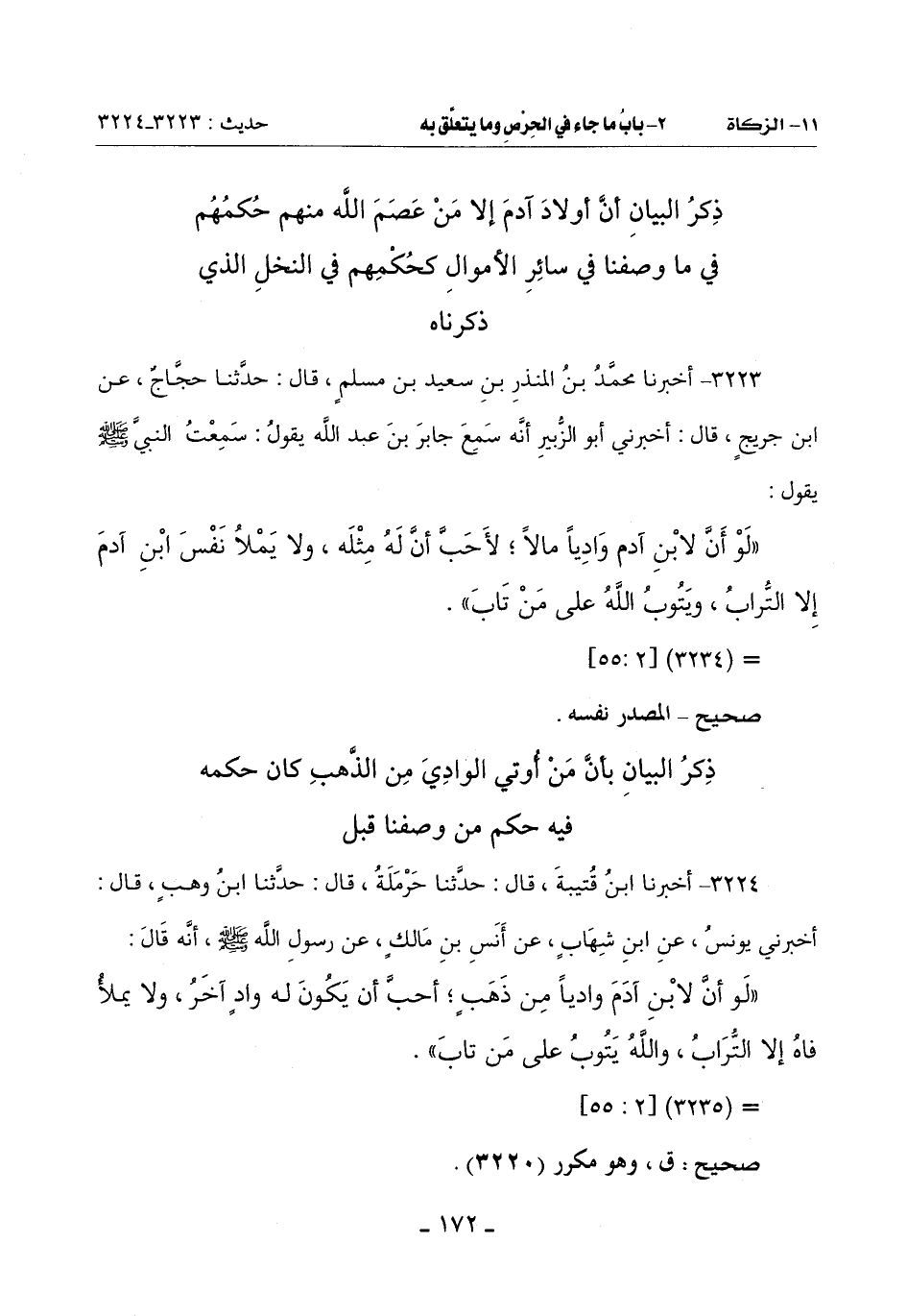 (لَوْ أَنَّ لِابْنِ آدَمَ وَادِيًا مَالًا لَأُحِبَّ أَنَّ لَهُ مِثْلَهُ وَلَا يَمْلَأُ نَفْسَ ابْنِ آدَمَ إِلَّا التُّرَابُ وَيَتُوبُ اللَّهُ عَلَى مَنْ تاب)