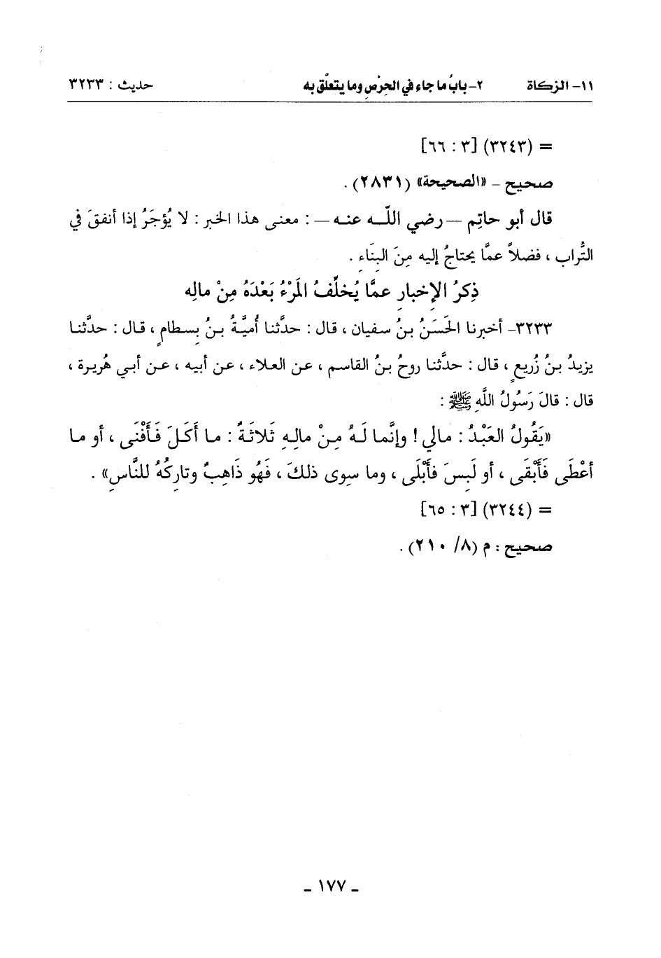 (يقول الْعَبْدُ مَالِي وَإِنَّمَا لَهُ مِنْ مَالِهِ ثَلَاثَةٌ: مَا أَكَلَ فَأَفْنَى أَوْ مَا أَعْطَى فَأَبْقَى أَوْ لَبِسَ فَأَبْلَى وَمَا سِوَى ذَلِكَ فَهُوَ ذاهب وتاركه للناس)
