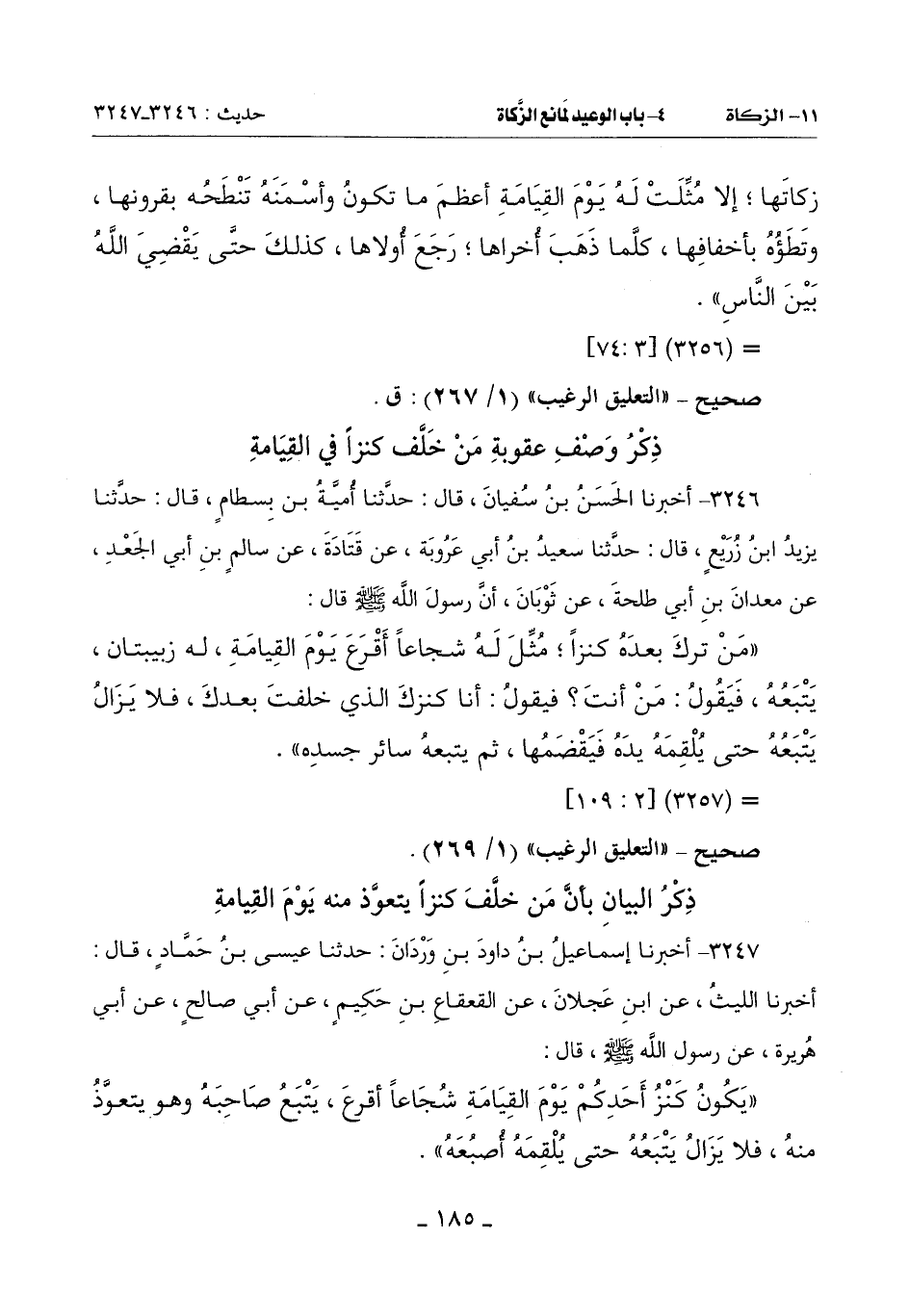 (يَكُونُ كَنْزُ أَحَدِكُمْ يَوْمَ الْقِيَامَةِ شُجَاعًا أَقْرَعَ يَتْبَعُ صَاحِبَهُ وَهُوَ يتعوَّذُ مِنْهُ فَلَا يَزَالُ يَتْبَعُهُ حتى يُلقِمه أصبعه) -[186]-