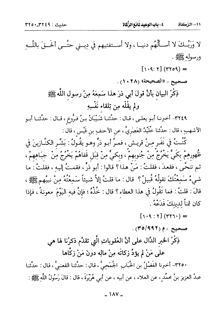 ذِكْرُ الْخَبَرِ الدَّالِّ عَلَى أَنَّ الْعُقُوبَاتِ الَّتِي تَقَدَّمَ ذِكْرُنَا لَهَا هِيَ عَلَى مَنْ لَمْ يُؤَدِّ زَكَاتَهُ مِنْ مَالِهِ دُونَ مَنْ زَكَّاهَا