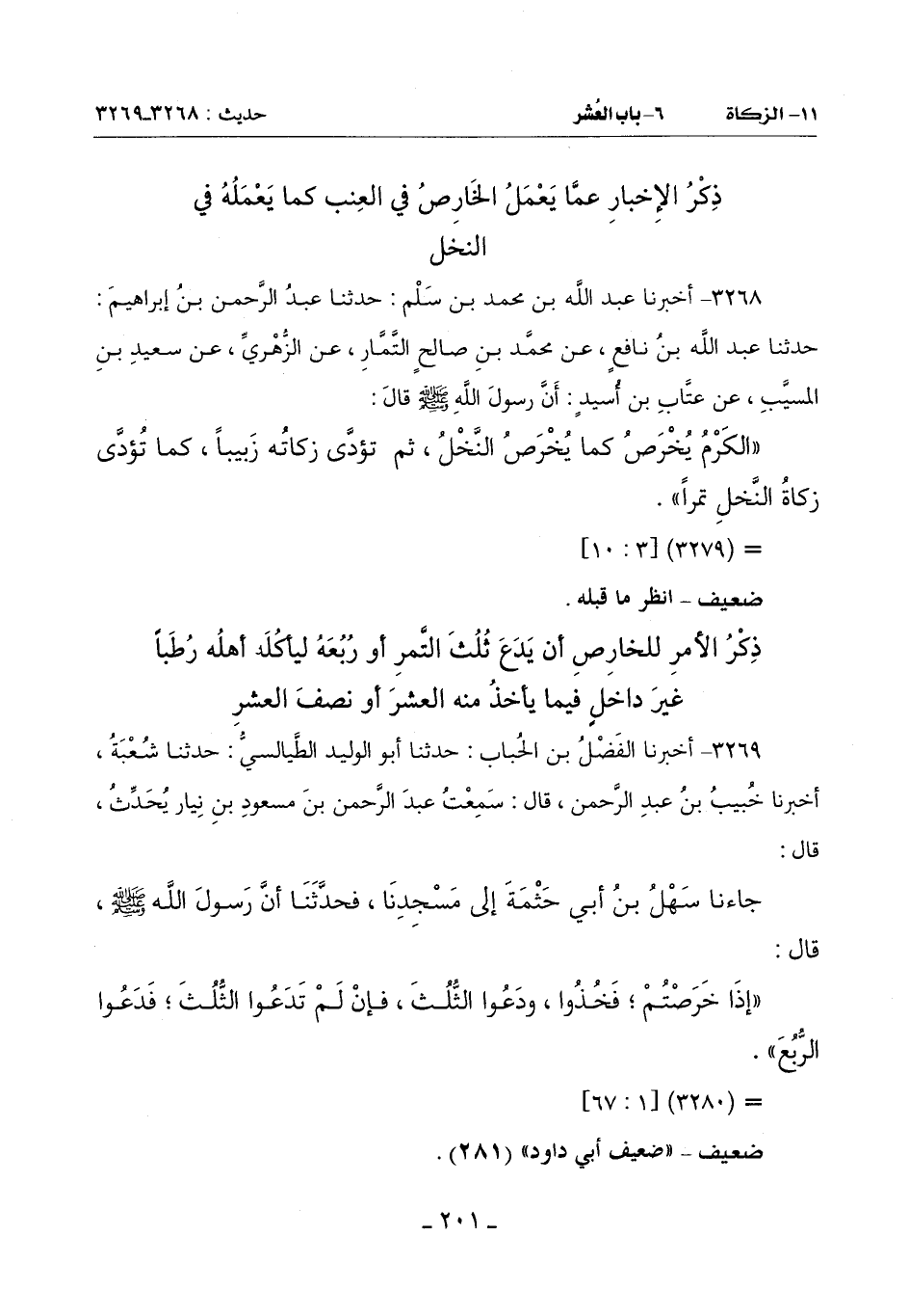 (الْكَرْمُ يُخرَص كَمَا يُخرَصُ النَّخْلُ ثُمَّ تُؤَدَّى زَكَاتُهُ زَبِيبًا كما تؤدَّى زكاة النخل تمراً)