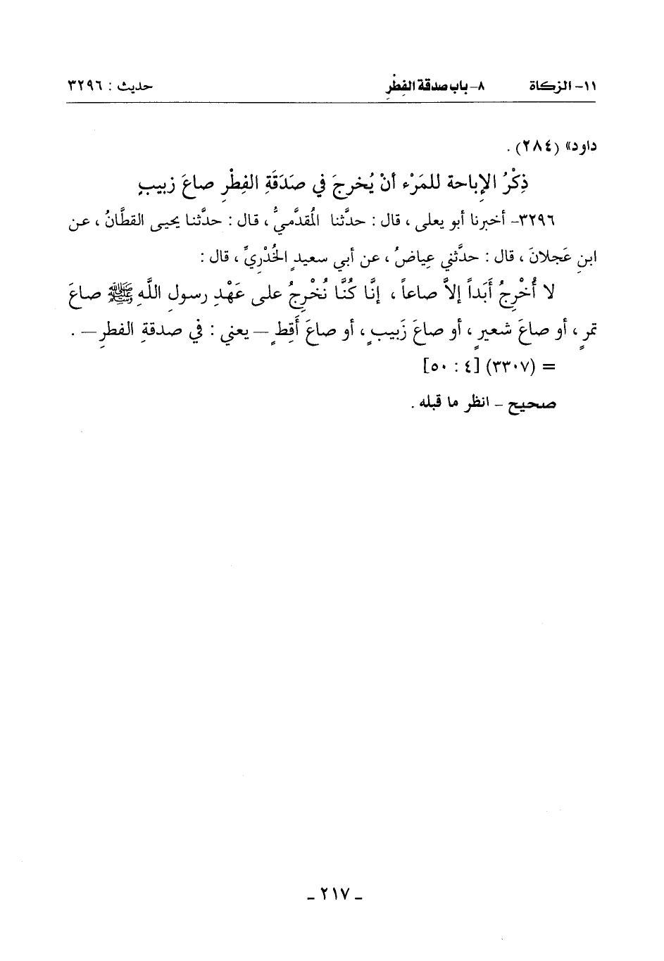 لَا أُخرِجُ أَبَدًا إِلَّا صَاعًا إِنَّا كُنَّا نُخرِجُ عَلَى عَهْدِ رَسُولِ اللَّهِ صَلَّى اللَّهُ عَلَيْهِ وَسَلَّمَ صَاعَ تَمْرٍ أَوْ صَاعَ شَعِيرٍ أوصاع زبيبٍ أَوْ صَاعَ أَقِطٍ - يَعْنِي فِي صَدَقَةِ الفطر -