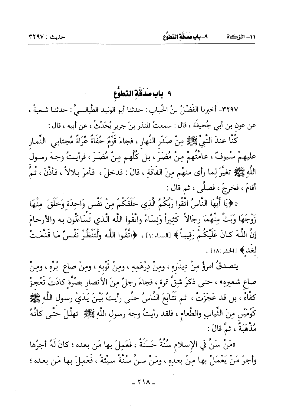 (مَنْ سَنَّ فِي الْإِسْلَامِ سُنَّةً حَسَنَةً فَعَمِلَ بِهَا مَنْ بَعْدَهُ كَانَ لَهُ أَجْرُهَا وَأَجْرُ مَنْ يَعْمَلُ بِهَا مِنْ بَعْدِهِ وَمَنْ سَنَّ سُنَّةً سيِّئةً فَعَمِلَ بِهَا مَنْ بَعْدَهُ -[219]- كَانَ عَلَيْهِ وِزْرُهَا وَوِزْرُ من عَمِلَ بها من بعده)