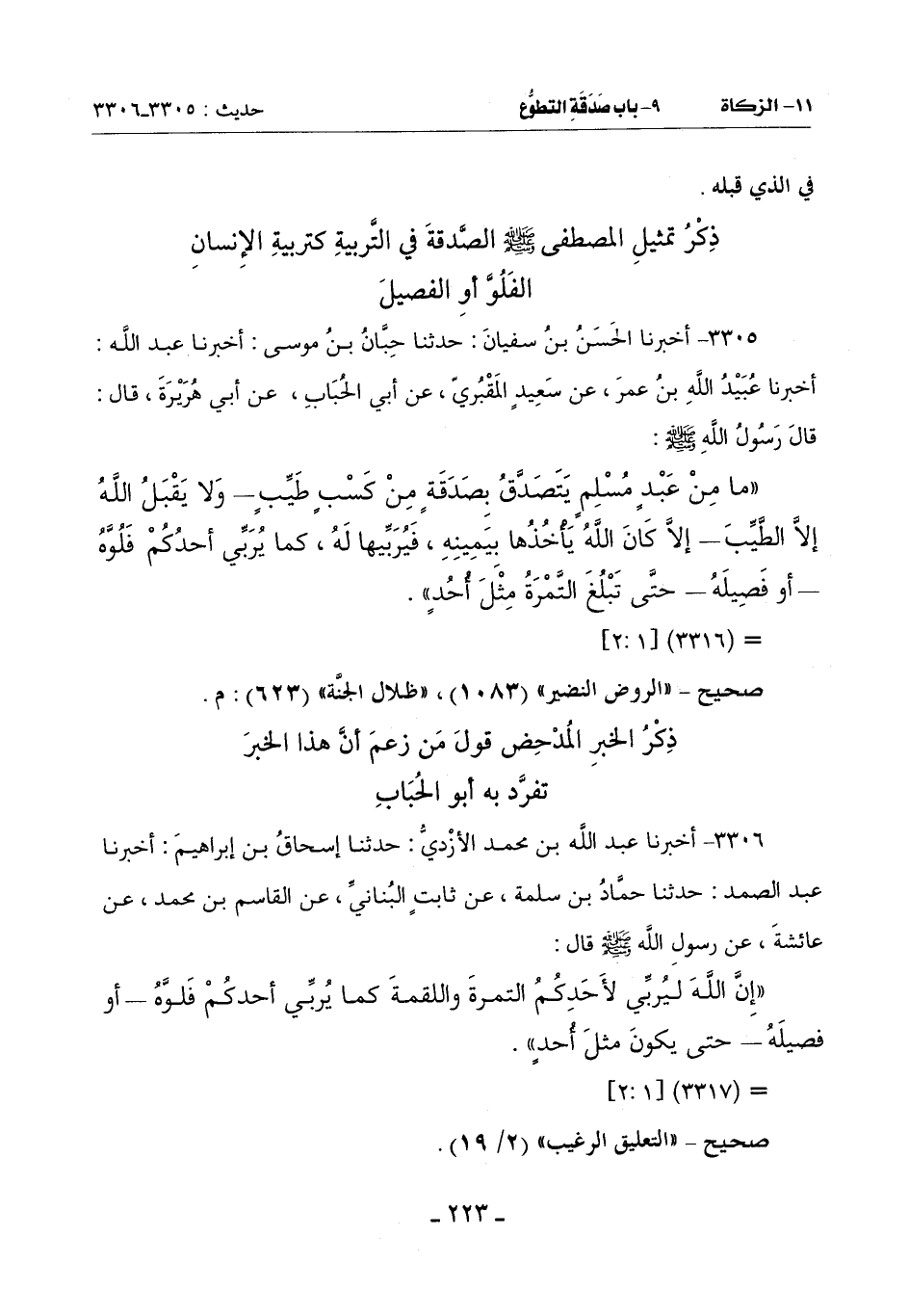 ذِكْرُ تَمْثِيلِ الْمُصْطَفَى صَلَّى اللَّهُ عَلَيْهِ وَسَلَّمَ الصَّدَقَةَ فِي التَّرْبِيَةِ كَتَرْبِيَةِ الْإِنْسَانِ الفَلُوَّ أَوِ الفصيل