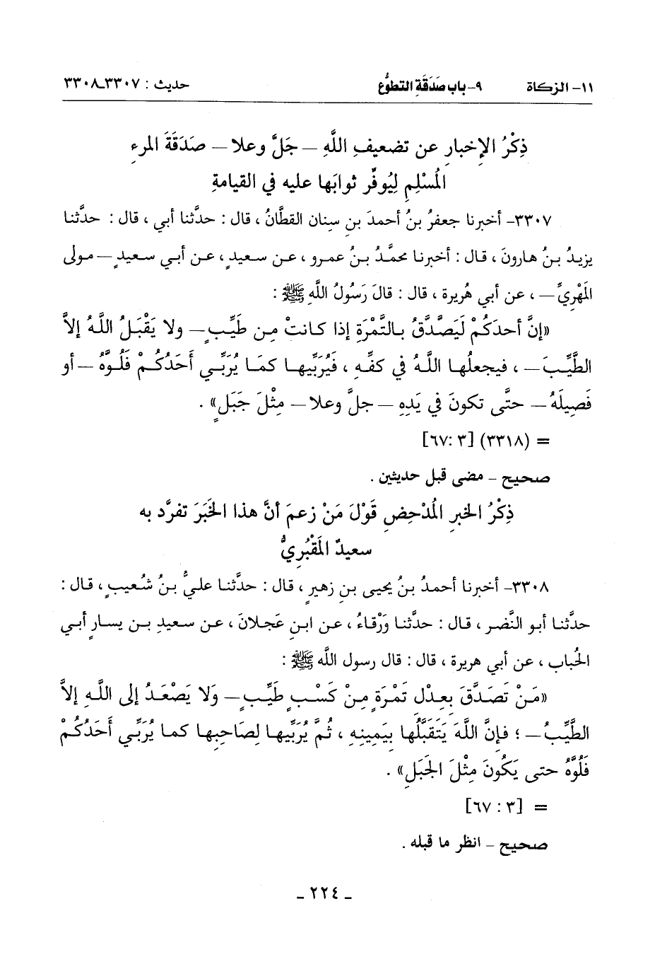 (إِنَّ أَحَدَكُمْ ليتصَّدَّق بِالتَّمْرَةِ إِذَا كَانَتْ مِنْ طَيِّبٍ ـ وَلَا يَقْبَلُ اللَّهُ إِلَّا الطَّيِّبَ ـ فيجعلُها اللَّهُ فِي كَفَّهِ فيربِّيها كَمَا يُرَبِّي أَحَدُكُمْ فَلُوَّهُ أَوْ فَصِيلَهُ حَتَّى تَكُونَ فِي يَدِهِ جَلَّ وَعَلَا مِثْلَ جَبَلٍ)