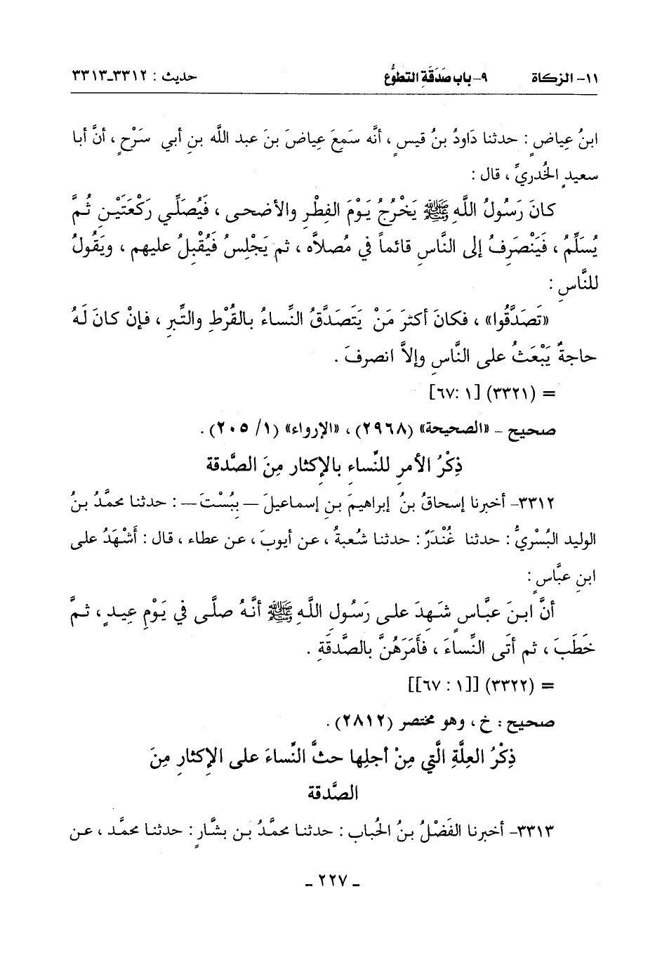 3313 - أَخْبَرَنَا الْفَضْلُ بْنُ الْحُبَابِ حَدَّثَنَا مُحَمَّدُ بْنُ بَشَّارٍ حَدَّثَنَا مُحَمَّدٌ عَنْ -[228]- شُعْبَةَ عَنِ الْحَكَمِ قَالَ: سَمِعْتُ ذَرًّا يُحَدِّثُ عَنْ وَائِلِ بْنِ مُهَانَةَ (¬1) , عَنِ ابْنِ مَسْعُودٍ عَنِ النَّبِيِّ صَلَّى اللَّهُ عَلَيْهِ وَسَلَّمَ أَنَّهُ قَالَ لِلنِّسَاءِ:
