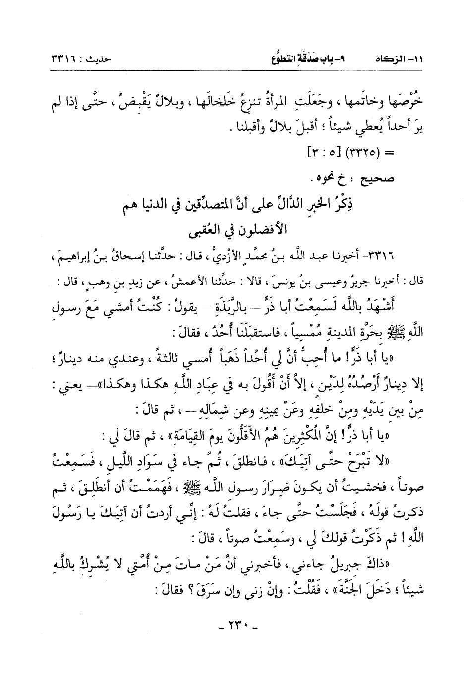 (ذَاكَ جِبْرِيلُ جَاءَنِي فَأَخْبَرَنِي أَنَّ مَنْ مَاتَ مِنْ أُمَّتِي لَا يُشْرِكُ بِاللَّهِ شَيْئًا دَخَلَ الْجَنَّةَ) فَقُلْتُ: وَإِنْ زَنَى وَإِنْ سَرَقَ؟ فَقَالَ: -[231]-