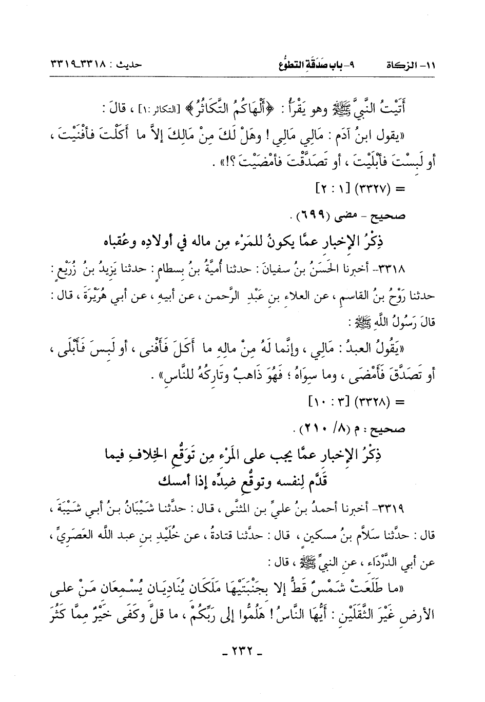 (يقول الْعَبْدُ: مَالِي وَإِنَّمَا لَهُ مِنْ مَالِهِ مَا أَكَلَ فَأَفْنَى أَوْ لَبِسَ فَأَبْلَى أَوْ تَصَدَّقَ فَأَمْضَى وَمَا سِوَاهُ فَهُوَ ذَاهِبٌ وَتَارِكُهُ لِلنَّاسِ)