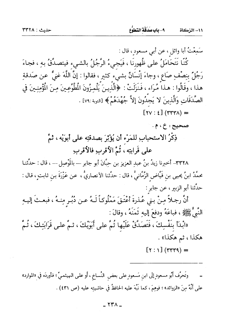 3328 - أَخْبَرَنَا زَيْدُ بْنُ عَبْدِ الْعَزِيزِ بْنِ حِبَّانَ أَبُو جَابِرٍ بِالْمَوْصِلِ قَالَ: حَدَّثَنَا مُحَمَّدُ بْنُ يَحْيَى بْنِ فَيَّاضٍ الزِّمَّانِيُّ قَالَ: حَدَّثَنَا الْأَنْصَارِيُّ عَنْ عَزْرَةَ بْنِ ثَابِتٍ قَالَ: حَدَّثَنَا أَبُو الزُّبَيْرِ عَنْ جَابِرٍ: