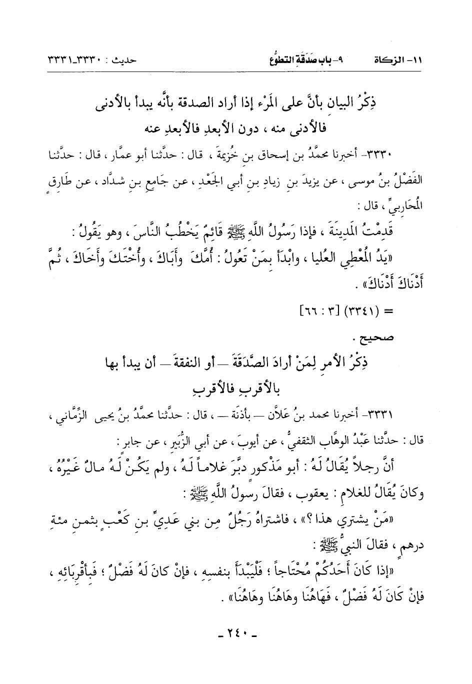 (إِذَا كَانَ أَحَدُكُمْ مُحْتَاجًا فَلْيَبْدَأْ بِنَفْسِهِ فَإِنْ كَانَ لَهُ فضلٌ فَبِأَقْرِبَائِهِ فَإِنْ كَانَ لَهُ فضل فهاهنا وهاهنا وهاهنا) -[241]-