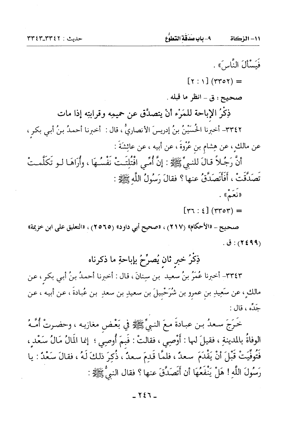 خَرَجَ سَعْدُ بْنُ عُبَادَةَ مَعَ النَّبِيِّ صَلَّى اللَّهُ عَلَيْهِ وَسَلَّمَ فِي بَعْضِ مَغَازِيهِ وَحَضَرَتْ أُمَّهُ الْوَفَاةُ بِالْمَدِينَةِ فَقِيلَ لَهَا أُوصِي فَقَالَتْ: فَبِمَ أُوصِي إِنَّمَا الْمَالُ مَالُ سعدٍ فتُوفِّيت قَبْلَ أَنْ يَقْدِمَ سَعْدٌ فَلَمَّا قَدِمَ سَعْدٌ ذُكِرَ ذَلِكَ لَهُ فَقَالَ سعد: يارسول اللَّهِ هَلْ يَنْفَعُهَا أَنْ أَتَصَدَّقُ عَنْهَا؟ فَقَالَ النَّبِيُّ صَلَّى اللَّهُ عَلَيْهِ وَسَلَّمَ: -[247]-