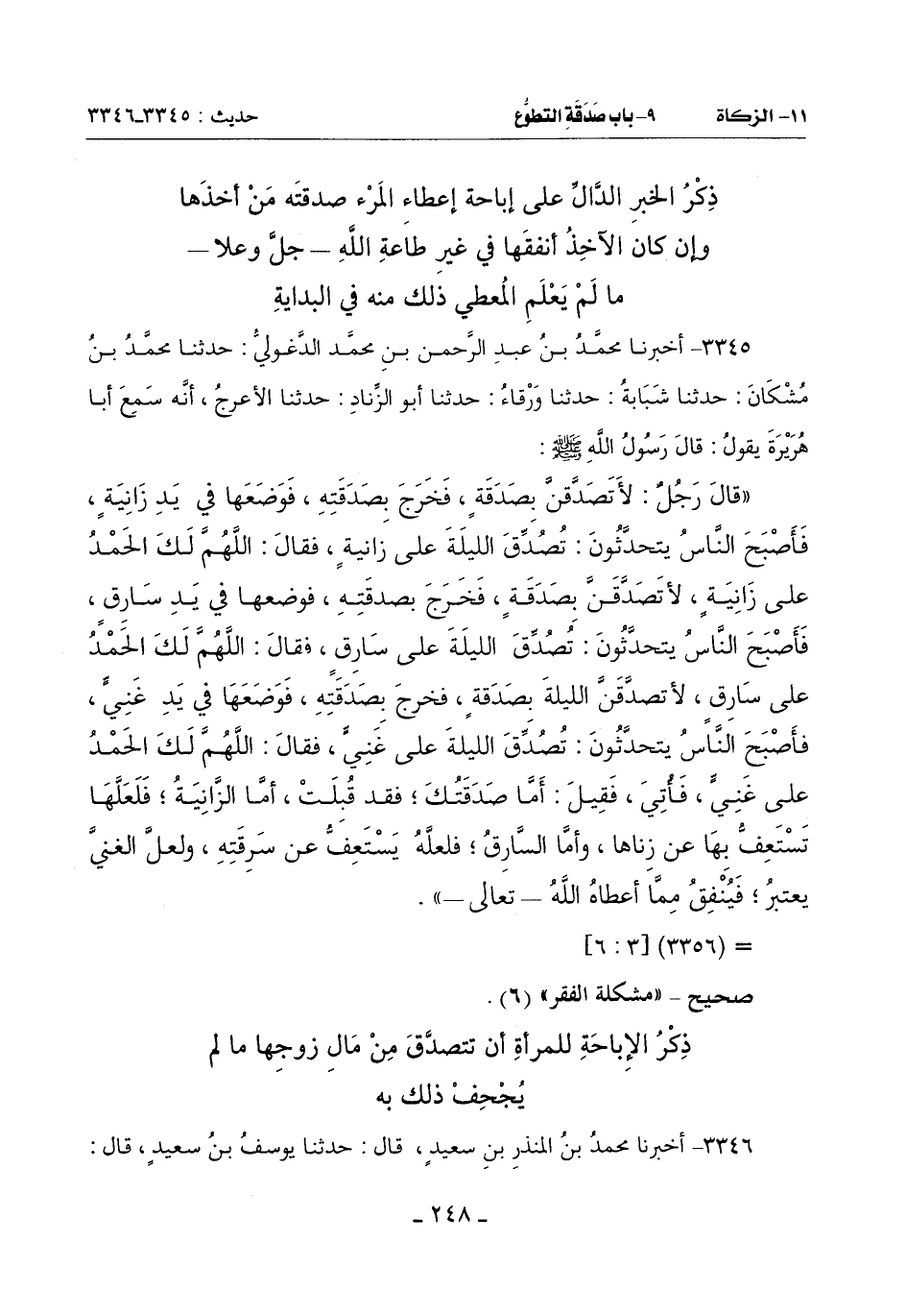 (قَالَ رَجُلٌ: لأتصدَّقنَّ بِصَدَقَةٍ فَخَرَجَ بِصَدَقَتِهِ فَوَضَعَهَا فِي يَدِ زَانِيَةٍ فَأَصْبَحَ النَّاسُ يَتَحَدَّثُونَ: تُصُدِّق اللَّيْلَةَ عَلَى زَانِيَةٍ فَقَالَ: اللَّهُمَّ لَكَ الْحَمْدُ عَلَى زَانِيَةٍ! لأتصدَّقنَّ بِصَدَقَةٍ فَخَرَجَ بِصَدَقَتِهِ فَوَضَعَهَا فِي يَدِ سَارِقٍ فَأَصْبَحَ النَّاسُ يَتَحَدَّثُونَ: تُصُدِّق اللَّيْلَةَ عَلَى سَارِقٍ فَقَالَ: اللَّهُمَّ لَكَ الْحَمْدُ عَلَى سَارِقٍ لأتصدَّقنَّ اللَّيْلَةَ بِصَدَقَةٍ فَخَرَجَ بِصَدَقَتِهِ فَوَضَعَهَا فِي يَدِ غَنِيٍّ فَأَصْبَحَ النَّاسُ يَتَحَدَّثُونَ: تُصُدِّق اللَّيْلَةَ عَلَى غَنِيٍّ فَقَالَ: اللَّهُمَّ لَكَ الْحَمْدُ عَلَى غَنِيٍّ فأُتِيَ فَقِيلَ: أَمَّا صَدَقَتُكَ فَقَدْ قُبِلَتْ أَمَّا الزَّانِيَةُ فَلَعَلَّهَا تَسْتَعِفُّ بِهَا عَنْ زِنَاهَا وَأَمَّا السَّارِقُ فَلَعَلَّهُ يَسْتَعِفُّ عَنْ سَرِقَتِهِ وَلَعَلَّ الْغَنِيَّ يَعْتَبِرُ فيُنْفِقُ مِمَّا أَعْطَاهُ اللَّهُ تَعَالَى)