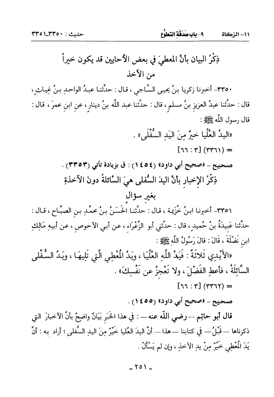 قَالَ أَبُو حَاتِمٍ ـ رَضِيَ اللَّهُ عَنْهُ ـ: فِي هَذَا الْخَبَرِ بَيَانٌ وَاضِحٌ بِأَنَّ الْأَخْبَارَ الَّتِي ذَكَرْنَاهَا ـ قَبْلُ ـ فِي كِتَابِنَا ـ هَذَا ـ أَنَّ الْيَدَ الْعُلْيَا خَيْرٌ مِنَ الْيَدِ السُّفْلَى أَرَادَ بِهِ أَنَّ يَدَ الْمُعْطِي خَيْرٌ مِنْ يَدِ الْآخِذِ وَإِنْ لَمْ يَسْأَلْ -[252]-