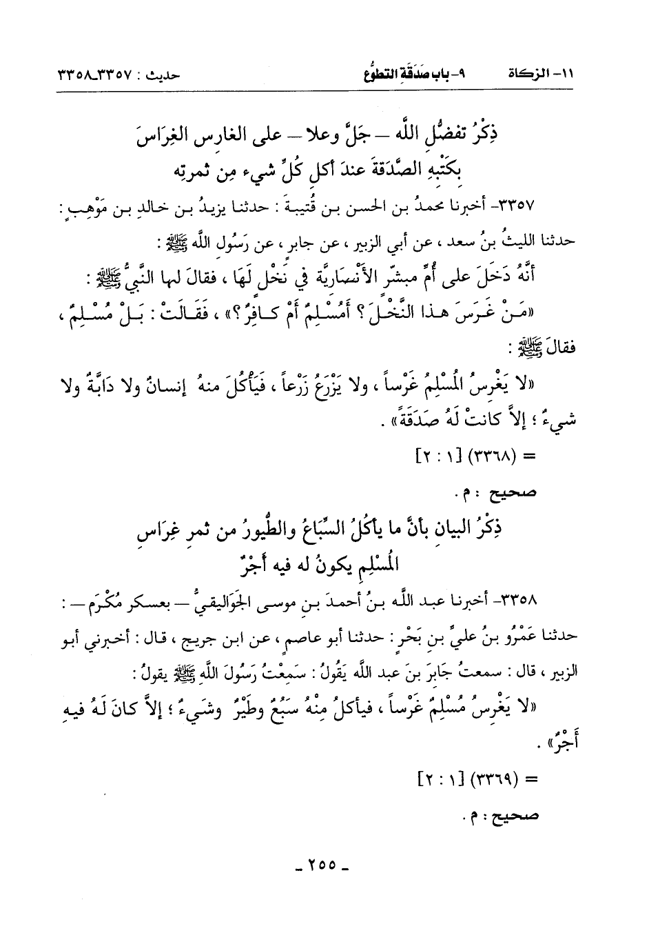 (لَا يَغْرِسُ الْمُسْلِمُ غَرْسًا وَلَا يَزْرَعُ زَرْعًا فَيَأْكُلُ مِنْهُ إِنْسَانٌ وَلَا دَابَّةٌ وَلَا شَيْءٌ إِلَّا كَانَتْ لَهُ صَدَقَةٌ)