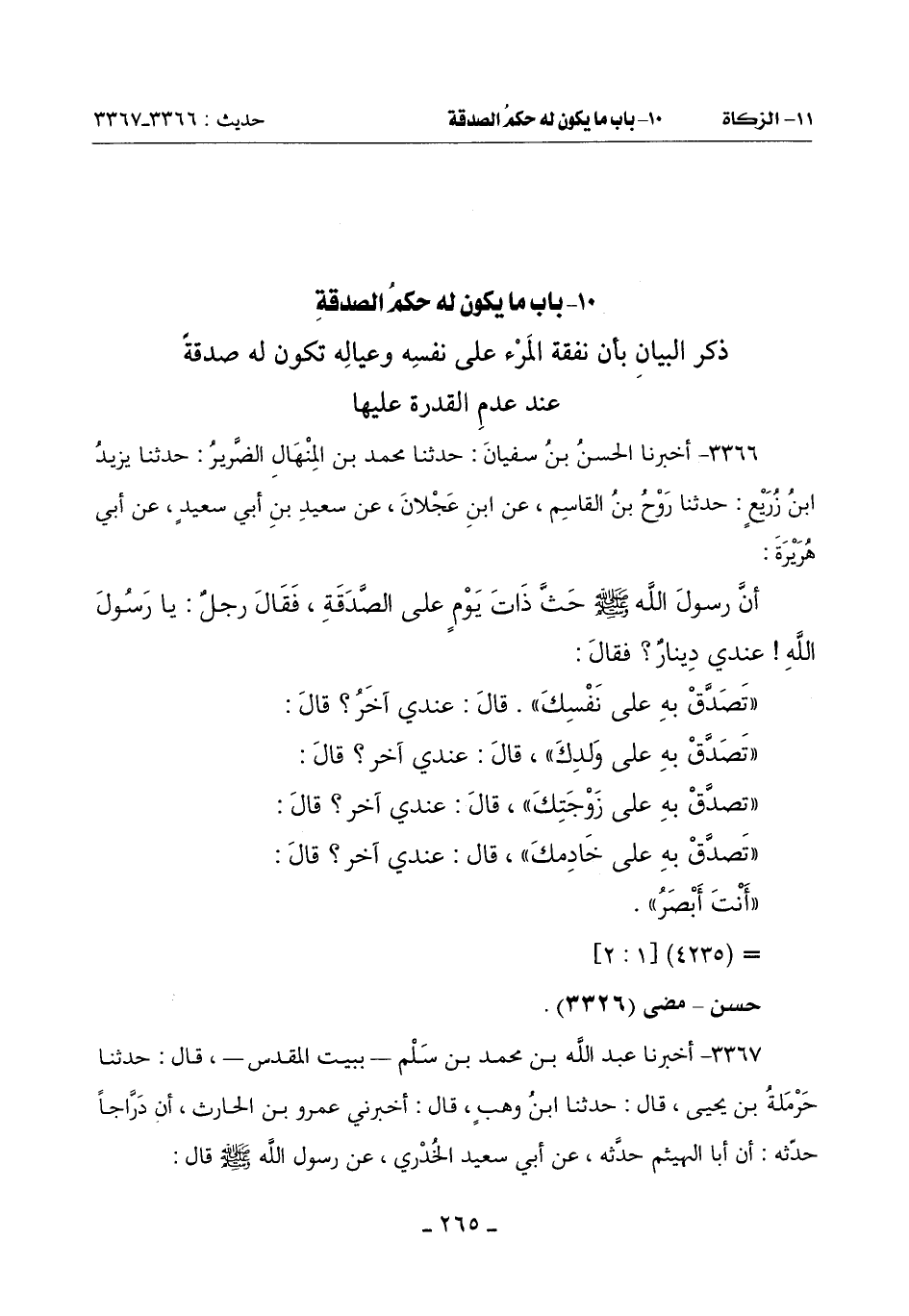3366 ـ أَخْبَرَنَا الْحَسَنُ بْنُ سُفْيَانَ: حَدَّثَنَا مُحَمَّدُ بْنُ الْمِنْهَالِ الضَّرِيرُ: حَدَّثَنَا يَزِيدُ بْنُ زُرَيْعٍ: حَدَّثَنَا رَوْحِ بْنِ الْقَاسِمِ , عَنِ ابْنِ عَجْلَانَ , عَنْ سَعِيدِ بْنِ أَبِي سَعِيدٍ , عَنْ أَبِي هُرَيْرَةَ: