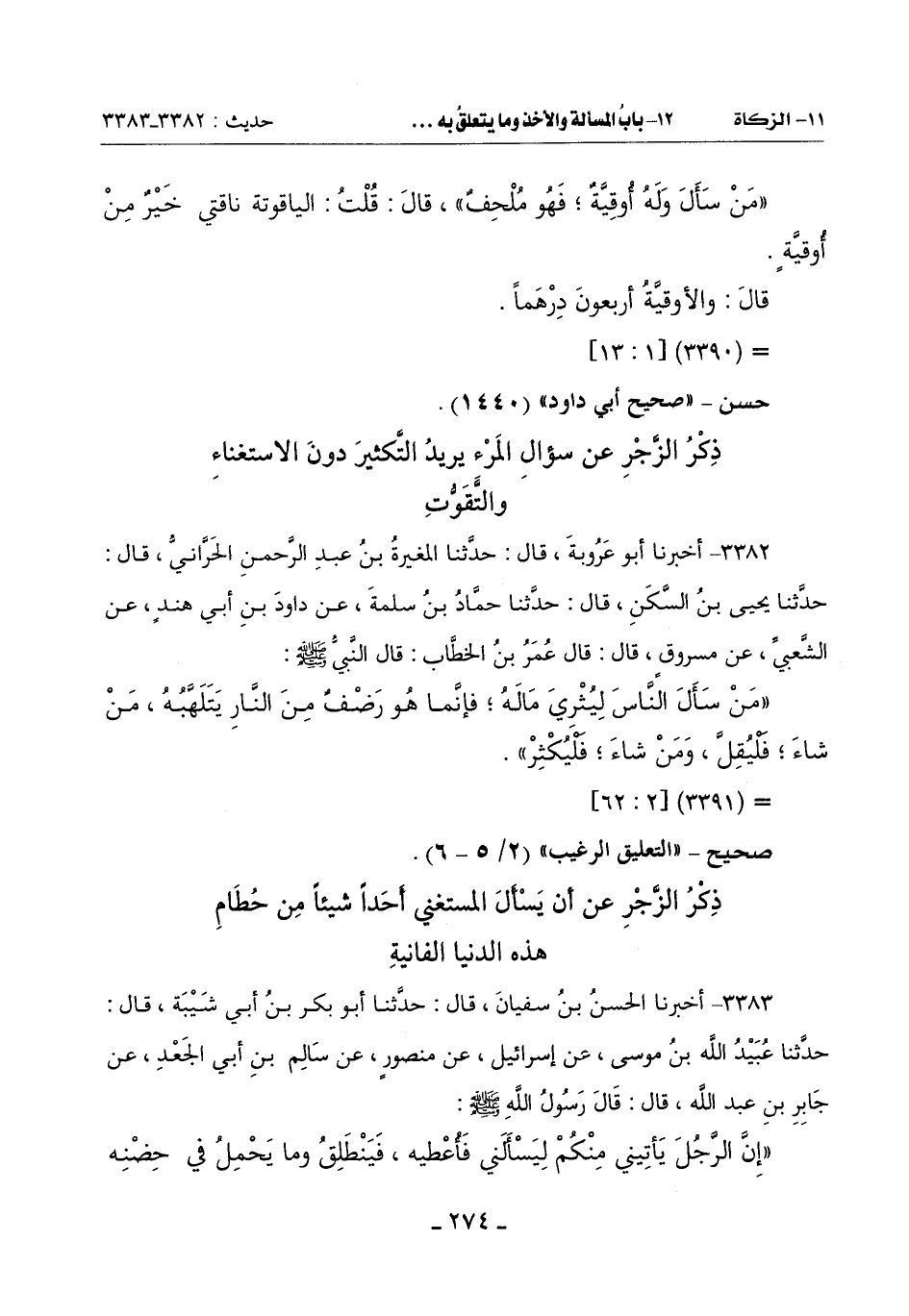 (إِنَّ الرَّجُلَ يَأْتِينِي مِنْكُمْ لَيَسْأَلَنِي فَأُعْطِيهِ فَيَنْطَلِقُ وَمَا يَحْمِلُ فِي حضنه -[275]- إلا النار)