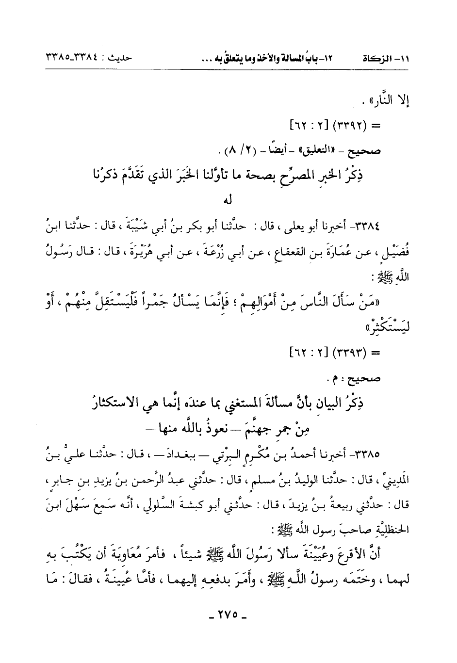 3384 - أَخْبَرَنَا أَبُو يَعْلَى قَالَ: حَدَّثَنَا أَبُو بَكْرِ بْنُ أَبِي شَيْبَةَ قَالَ: حَدَّثَنَا ابْنُ فُضَيْلٍ عَنْ عُمَارَةَ بْنِ الْقَعْقَاعِ عَنْ أَبِي زُرْعَةَ عَنْ أَبِي هُرَيْرَةَ قَالَ: قَالَ رَسُولُ اللَّهِ صَلَّى اللَّهُ عَلَيْهِ وَسَلَّمَ: