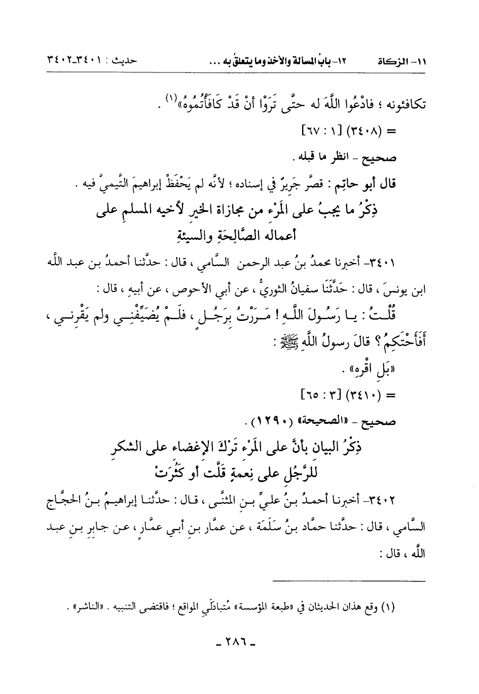 3402 - أَخْبَرَنَا أَحْمَدُ بْنُ عَلِيِّ بْنِ الْمُثَنَّى قَالَ: حَدَّثَنَا إِبْرَاهِيمُ بْنُ الْحَجَّاجِ السَّامِيُّ قَالَ: حَدَّثَنَا حَمَّادُ بْنُ سَلَمَةَ عَنْ عَمَّارِ بْنِ أَبِي عَمَّارٍ: عَنْ جَابِرِ بْنِ عَبْدِ اللَّهِ قَالَ: -[287]-