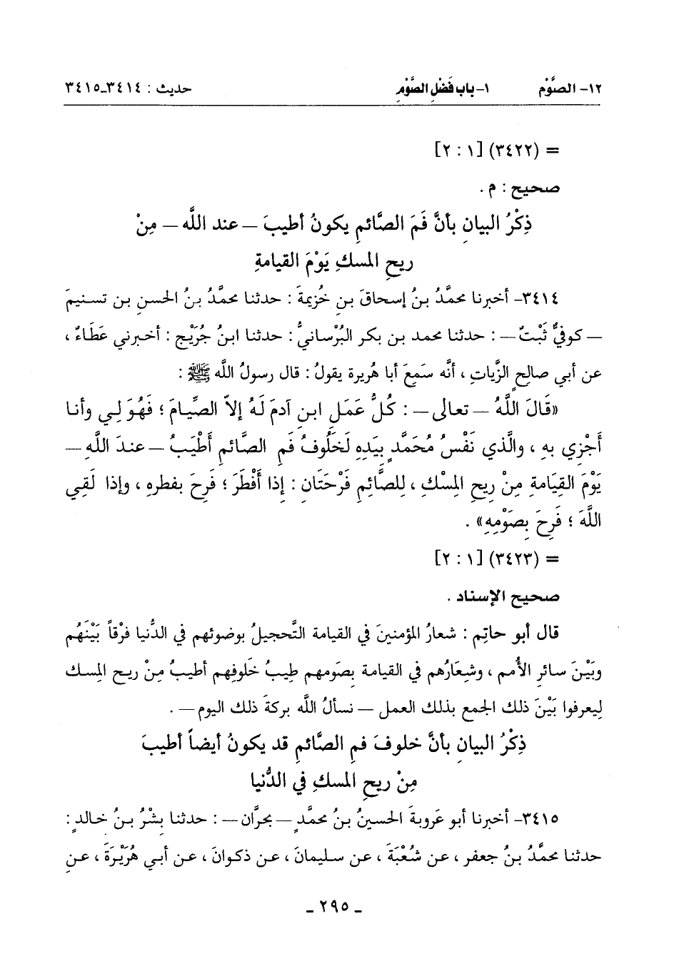 ذِكْرُ الْبَيَانِ بِأَنَّ خُلُوفَ فَمِ الصَّائِمِ قَدْ يَكُونُ أَيْضًا أَطْيَبَ مِنْ رِيحِ الْمِسْكِ فِي الدنيا