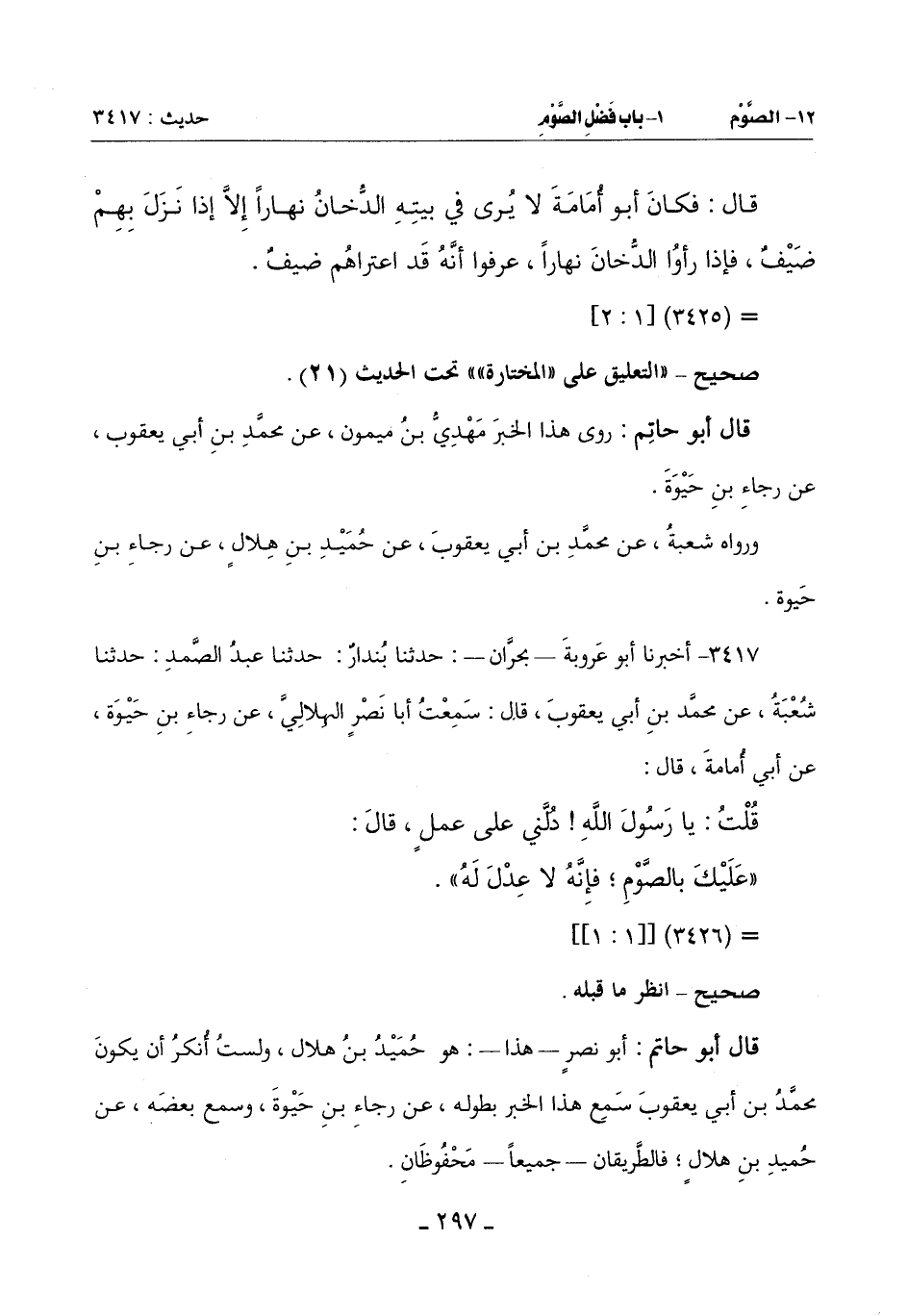 3417 - أَخْبَرَنَا أَبُو عَرُوبَةَ بِحَرَّانَ حَدَّثَنَا بُنْدَارٌ حَدَّثَنَا عَبْدُ الصَّمَدِ حَدَّثَنَا شُعْبَةُ عَنْ مُحَمَّدِ بْنِ أَبِي يَعْقُوبَ قَالَ: سَمِعْتُ أَبَا نَصْرٍ الْهِلَالِيَّ عَنْ رَجَاءِ بْنِ حَيْوَةَ عَنْ أَبِي أُمَامَةَ قال: