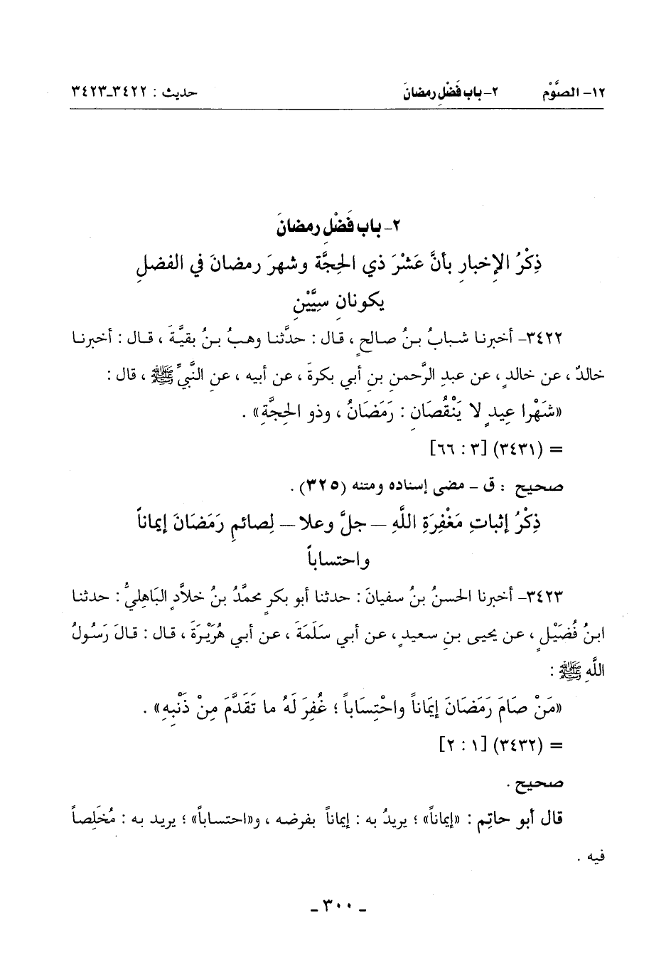 قَالَ أَبُو حَاتِمٍ: (إِيمَانًا) يُرِيدُ بِهِ إِيمَانًا بفرضه و (احتساباً): يُرِيدُ بِهِ مُخْلِصًا فِيهِ