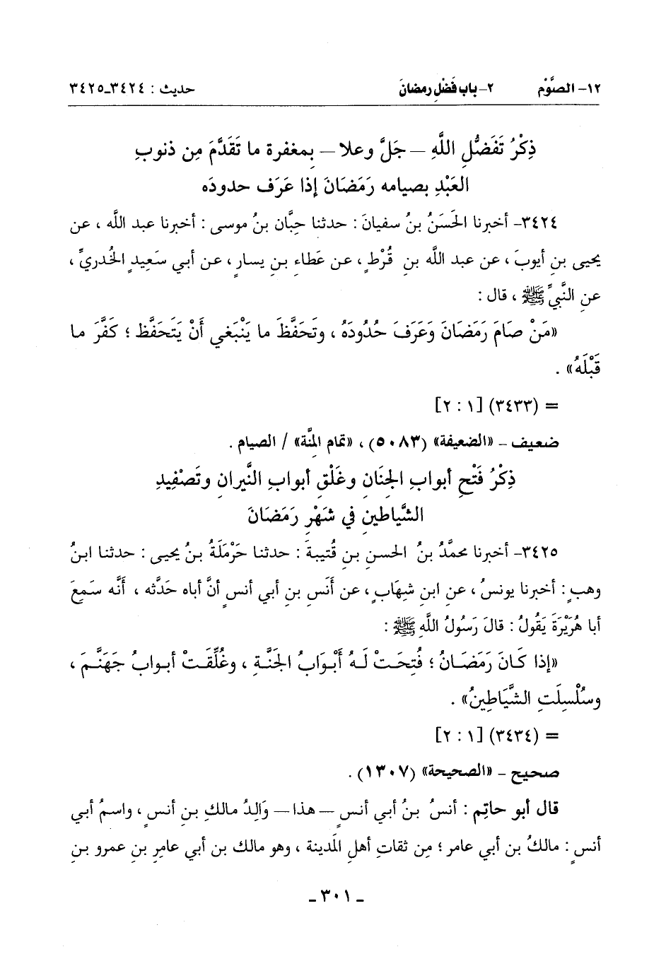 ذِكْرُ فَتْحِ أَبْوَابِ الْجِنَانِ وَغَلْقِ أَبْوَابِ النِّيرَانِ وَتَصْفِيدِ الشَّيَاطِينِ فِي شَهْرِ رَمَضَانَ