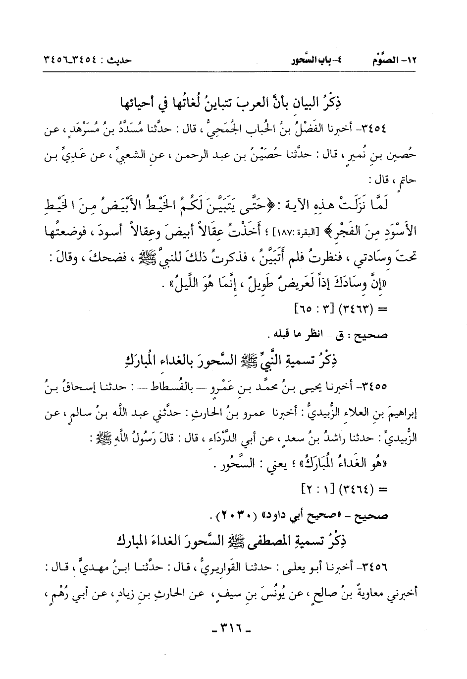 3454 - أَخْبَرَنَا الْفَضْلُ بْنُ الْحُبَابِ الْجُمَحِيُّ قَالَ: حَدَّثَنَا مُسَدَّدُ بْنُ مُسَرْهَدٍ عَنْ حُصَيْنِ بْنِ نُمَيْرٍ قَالَ: حَدَّثَنَا حُصَيْنُ بْنُ عَبْدِ الرَّحْمَنِ عَنْ الشَّعْبِيِّ عَنْ عَدِيِّ بْنِ حَاتِمٍ: قَالَ: