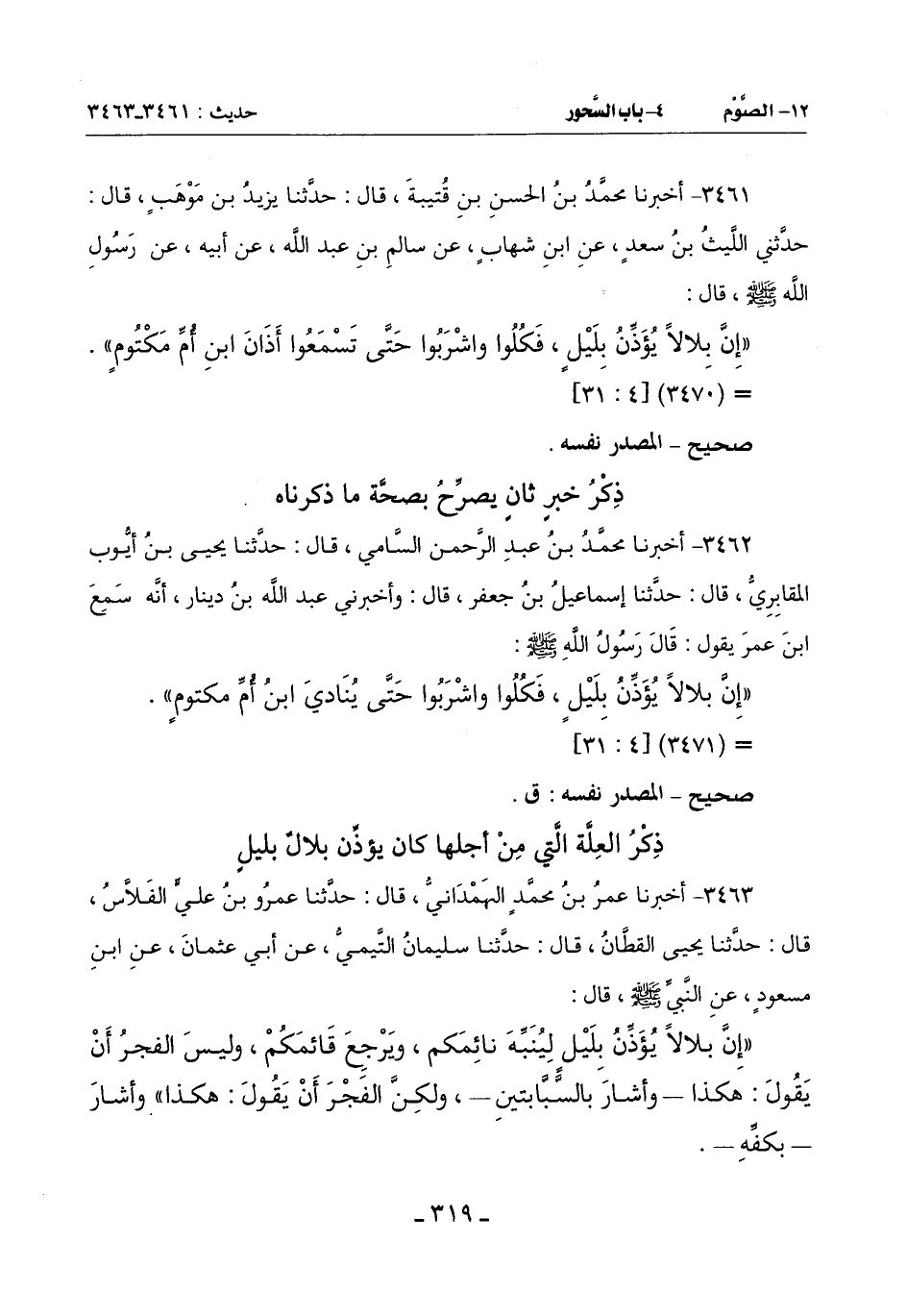 (إِنَّ بِلَالًا يُؤَذِّنُ بِلَيْلٍ لِيُنَبِّهَ نَائِمَكُمْ وَيَرْجِعَ قَائِمَكُمْ وَلَيْسَ الْفَجْرُ أَنْ يَقُولَ هَكَذَا وَأَشَارَ بِالسَّبَّابَتَيْنِ وَلَكِنَّ الْفَجْرَ أن يقول هكذا) وأشار بكفه -[320]-