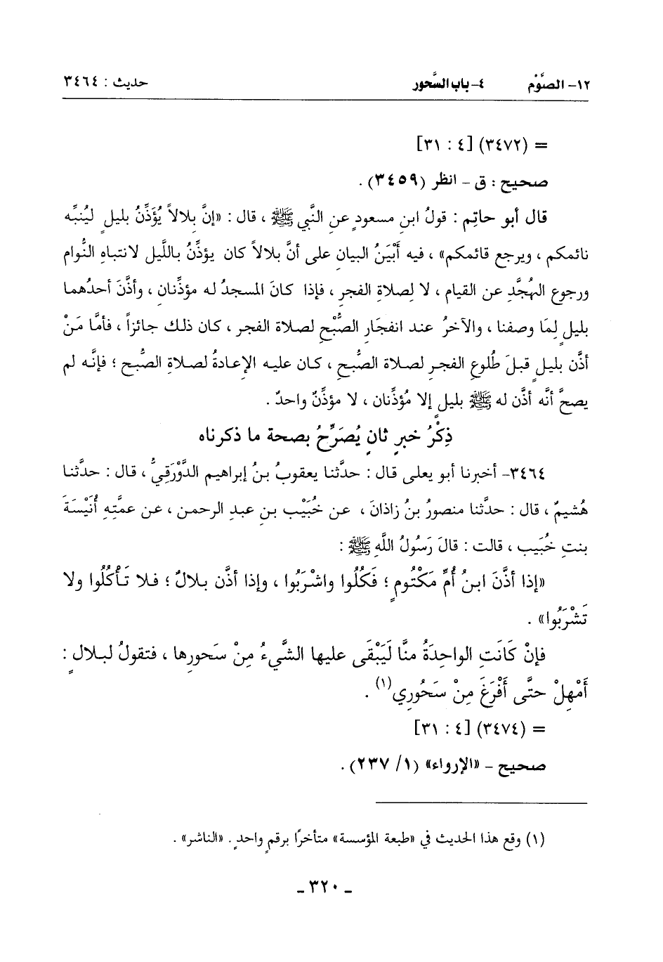 قَالَ أَبُو حَاتِمٍ ـ رَضِيَ اللَّهُ عَنْهُ ـ: هَذَانِ خَبَرَانِ قَدْ يُوهِمَانِ مَنْ لَمْ يُحْكِمْ صِنَاعَةَ الْعِلْمِ أَنَّهُمَا مُتَضَادَّانِ وَلَيْسَ كَذَلِكَ لِأَنَّ الْمُصْطَفَى صَلَّى اللَّهُ عَلَيْهِ وَسَلَّمَ كَانَ جَعَلَ اللَّيْلَ بَيْنَ بِلَالٍ وَبَيْنَ ابْنِ أُمِّ مَكْتُومٍ نَوْبًا فَكَانَ بِلَالٌ يؤذِّن بِاللَّيْلِ لَيَالِيَ مَعْلُومَةً لِيُنَبِّهَ النَّائِمَ ويَرْجِعَ الْقَائِمُ لَا لِصَلَاةِ الْفَجْرِ وَيُؤَذِّنُ ابْنُ أُمِّ مَكْتُومٍ فِي تِلْكَ اللَّيَالِيَ بَعْدَ انْفِجَارِ الصُّبْحِ لِصَلَاةِ الْغَدَاةِ فَإِذَا جَاءَتْ نَوْبَةُ ابْنِ أُمِّ مَكْتُومٍ كَانَ يُؤَذِّنُ بِاللَّيْلِ لَيَالِيَ مَعْلُومَةً كَمَا وَصَفْنَا قَبْلُ وَيُؤَذِّنُ بِلَالٌ فِي تِلْكَ اللَّيَالِيَ بَعْدَ انْفِجَارِ الصُّبْحِ لِصَلَاةِ الْغَدَاةِ مِنْ غَيْرِ أَنْ يَكُونَ بَيْنَ الْخَبَرَيْنِ تَضَادٌّ أو تهاتر