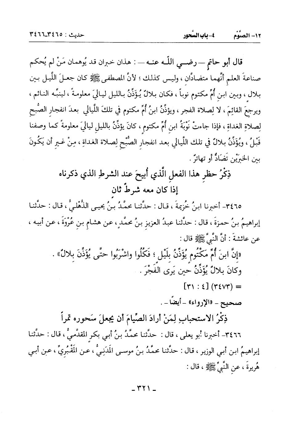 (إِنَّ ابْنَ أُمِّ مَكْتُومٍ يُؤَذِّنَ بِلَيْلٍ فَكُلُوا وَاشْرَبُوا حَتَّى يُؤَذِّنَ بِلَالٌ)