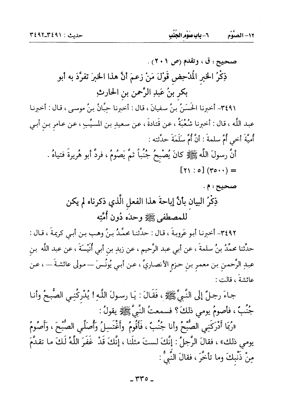 (ربما أدركني الصبح وأنا جنب فأقوم وأغتسل وَأُصَلِّي الصُّبْحَ وَأَصُومُ يَوْمِي ذَلِكَ) فَقَالَ الرَّجُلُ: إِنَّكَ لَسْتَ مِثْلَنَا إِنَّكَ قَدْ غَفَرَ اللَّهُ لَكَ مَا تَقَدَّمَ مِنْ ذَنْبِكَ وَمَا تَأَخَّرَ فَقَالَ النَّبِيُّ: -[336]-