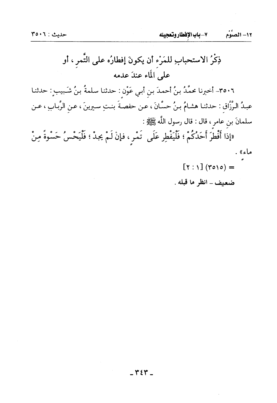 3506 - أخبرنا محمد بن أحمد ين أَبِي عَوْنٍ حَدَّثَنَا سَلَمَةُ بْنُ شَبِيبٍ حَدَّثَنَا عَبْدُ الرَّزَّاقِ حَدَّثَنَا هِشَامُ بْنُ حَسَّانَ عَنْ حَفْصَةَ بِنْتِ سِيرِينَ عَنِ الرَّباب عَنْ سَلْمَانَ بْنِ عَامِرٍ قَالَ: قَالَ رَسُولُ اللَّهِ صَلَّى اللَّهُ عَلَيْهِ وَسَلَّمَ:
