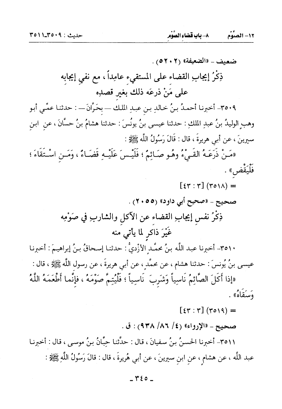 3511 - أَخْبَرَنَا الْحَسَنُ بْنُ سُفْيَانَ قَالَ: حَدَّثَنَا حِبَّانُ بْنُ مُوسَى قَالَ: أَخْبَرَنَا عَبْدُ اللَّهِ عَنْ هِشَامٍ عَنِ ابْنِ سِيرِينَ عَنْ أَبِي هُرَيْرَةَ قَالَ: قَالَ رَسُولُ اللَّهِ صَلَّى اللَّهُ عَلَيْهِ وَسَلَّمَ: -[346]-