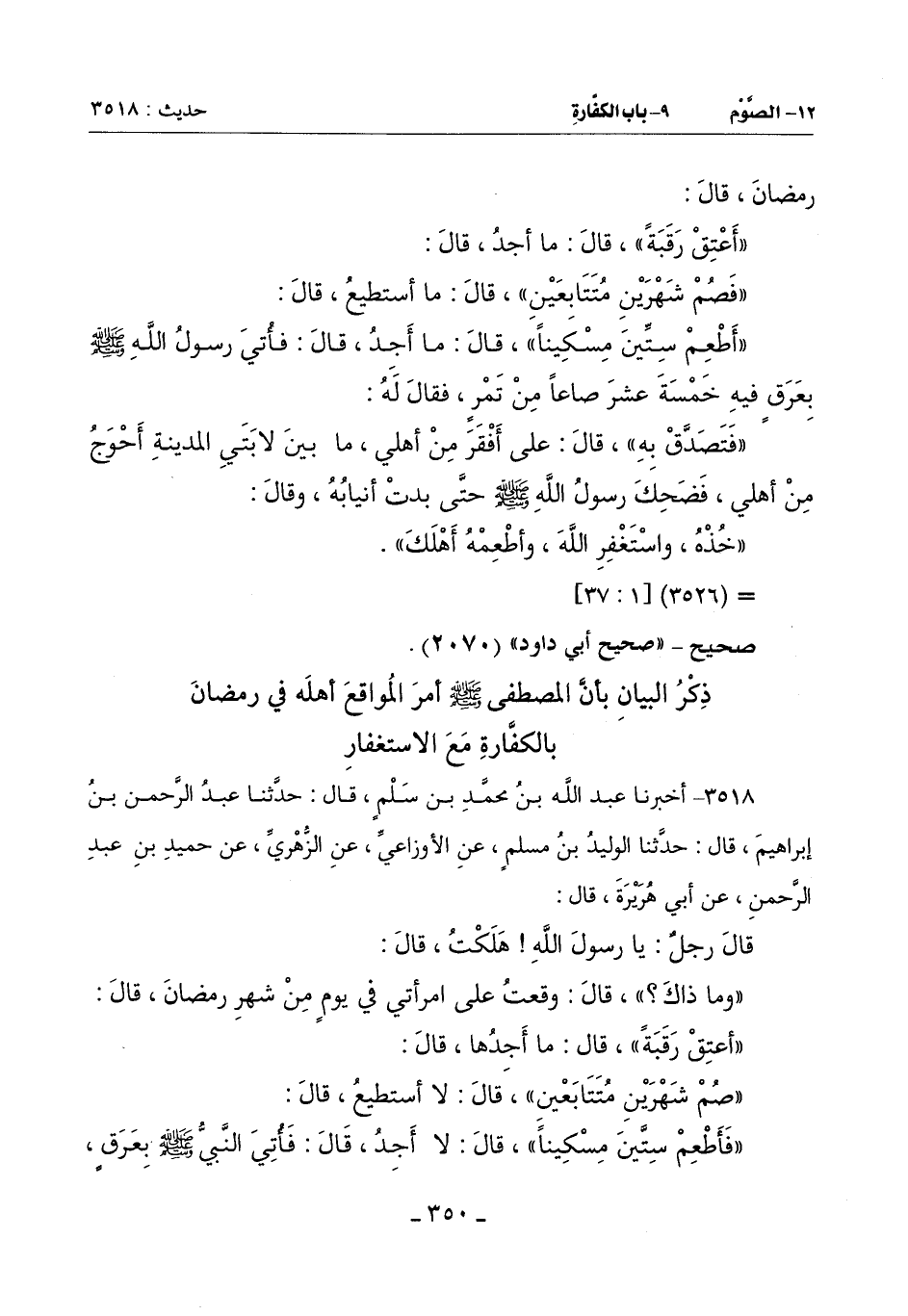 3518 - أَخْبَرَنَا عَبْدُ اللَّهِ بْنُ مُحَمَّدِ بْنِ سَلْمٍ قَالَ: حَدَّثَنَا عَبْدُ الرَّحْمَنِ بْنُ إِبْرَاهِيمَ قَالَ: حَدَّثَنَا الْوَلِيدُ بْنُ مُسْلِمٍ عَنِ الْأَوْزَاعِيِّ عَنْ الزُّهْرِيِّ عَنْ حُمَيْدِ بْنِ عَبْدِ الرَّحْمَنِ عَنْ أَبِي هريرة قال: