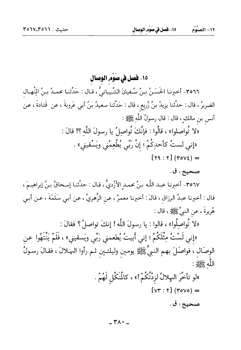 (إِنِّي لَسْتُ مِثْلَكُمْ إِنِّي أبيتُ يُطعمني رَبِّي وَيَسْقِينِي) فَلَمْ يَنْتَهُوا عَنِ الْوِصَالِ فَوَاصَلَ بِهِمُ النَّبِيُّ صَلَّى اللَّهُ عَلَيْهِ وَسَلَّمَ يَوْمَيْنِ وَلَيْلَتَيْنِ ثُمَّ رَأَوَا الْهِلَالَ فَقَالَ رَسُولُ اللَّهِ صَلَّى اللَّهُ عَلَيْهِ وَسَلَّمَ: