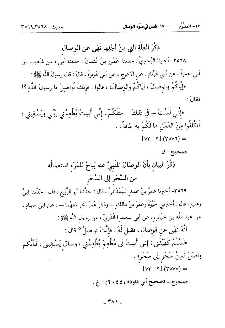 (لَسْتُمْ كَهَيْئَتِي إِنِّي أَبِيتُ لِيَ مُطْعِمٌ يُطْعِمُني وساقٍ يَسقيني فَأَيُّكُمْ وَاصَلَ فمِنْ سَحَرٍ إلى سَحَرٍ)