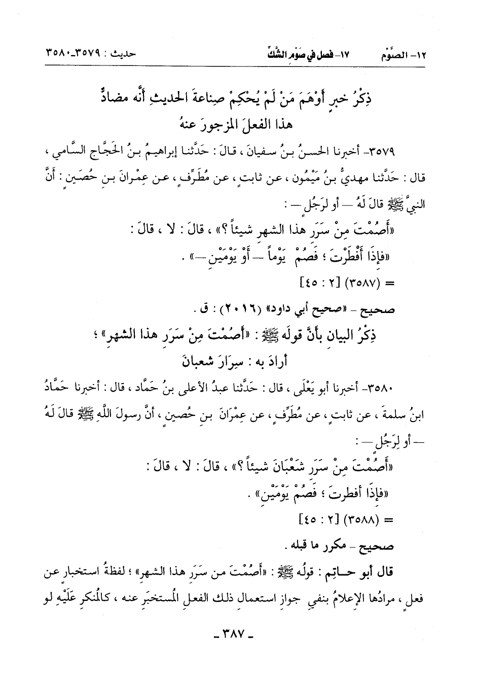 قَالَ أَبُو حَاتِمٍ: قَوْلُهُ صَلَّى اللَّهُ عَلَيْهِ وَسَلَّمَ: (أصُمْتَ مِنْ سَرَرِ هَذَا الشَّهْرِ) لفظةُ اسْتِخْبَارٍ عَنْ فَعَلٍ مُرَادُهَا الْإِعْلَامَ بِنَفْيِ جَوَازِ اسْتِعْمَالِ ذَلِكَ الْفِعْلِ الْمُسْتَخْبَرِ عَنْهُ كَالْمُنْكِرِ عَلَيْهِ لَوْ -[388]- فَعَلَهُ وَهَذَا كَقَوْلِهِ صَلَّى اللَّهُ عَلَيْهِ وَسَلَّمَ لِعَائِشَةَ: (أتَسْتُرين الْجِدَارَ) أَرَادَ بِهِ الْإِنْكَارِ عَلَيْهَا بِلَفْظِ الِاسْتِخْبَارِ وَأَمَرَهُ صَلَّى اللَّهُ عَلَيْهِ وَسَلَّمَ بِصَوْمِ يَوْمَيْنِ مِنْ شَوَّالٍ أَرَادَ بِهِ أَنَّهَا السِّرار وَذَلِكَ أَنَّ الشَّهْرَ إِذَا كَانَ تِسْعًا وَعِشْرِينَ يَسْتَتِرُ الْقَمَرُ يَوْمًا وَاحِدًا وَإِذَا كَانَ الشَّهْرُ ثَلَاثِينَ يَسْتَتِرُ الْقَمَرُ يَوْمَيْنِ وَالْوَقْتُ الَّذِي خَاطَبَ صَلَّى اللَّهُ عَلَيْهِ وَسَلَّمَ بِهَذَا الْخِطَابِ يُشْبِهُ أَنْ يَكُونَ عَدَدُ شَعْبَانَ كَانَ ثَلَاثِينَ مِنْ أَجْلِهِ أَمَرَ بِصَوْمِ يَوْمَيْنِ مِنْ شوال