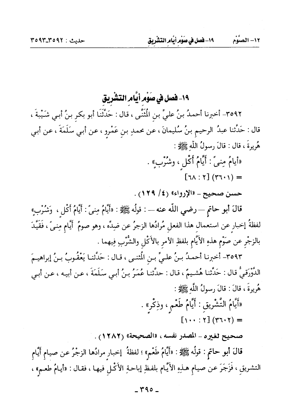 قَالَ أَبُو حَاتِمٍ: قَوْلُهُ صَلَّى اللَّهُ عَلَيْهِ وَسَلَّمَ: (أَيَّامُ طَعْمٍ) لَفْظَةُ إِخْبَارٍ مُرَادُهَا الزَّجْرُ عَنْ صِيَامِ أَيَّامِ التَّشْرِيقِ فَزَجَرَ عَنْ صِيَامِ هَذِهِ الْأَيَّامِ بِلَفْظِ إِبَاحَةِ الْأَكْلِ فِيهَا فَقَالَ: (أيامُ طعمٍ) -[396]- وَقَوْلُهُ صَلَّى اللَّهُ عَلَيْهِ وَسَلَّمَ: (وذِكْرٍ) قَصَدَ بِهِ النَّدْبَ وَالْإِرْشَادَ
