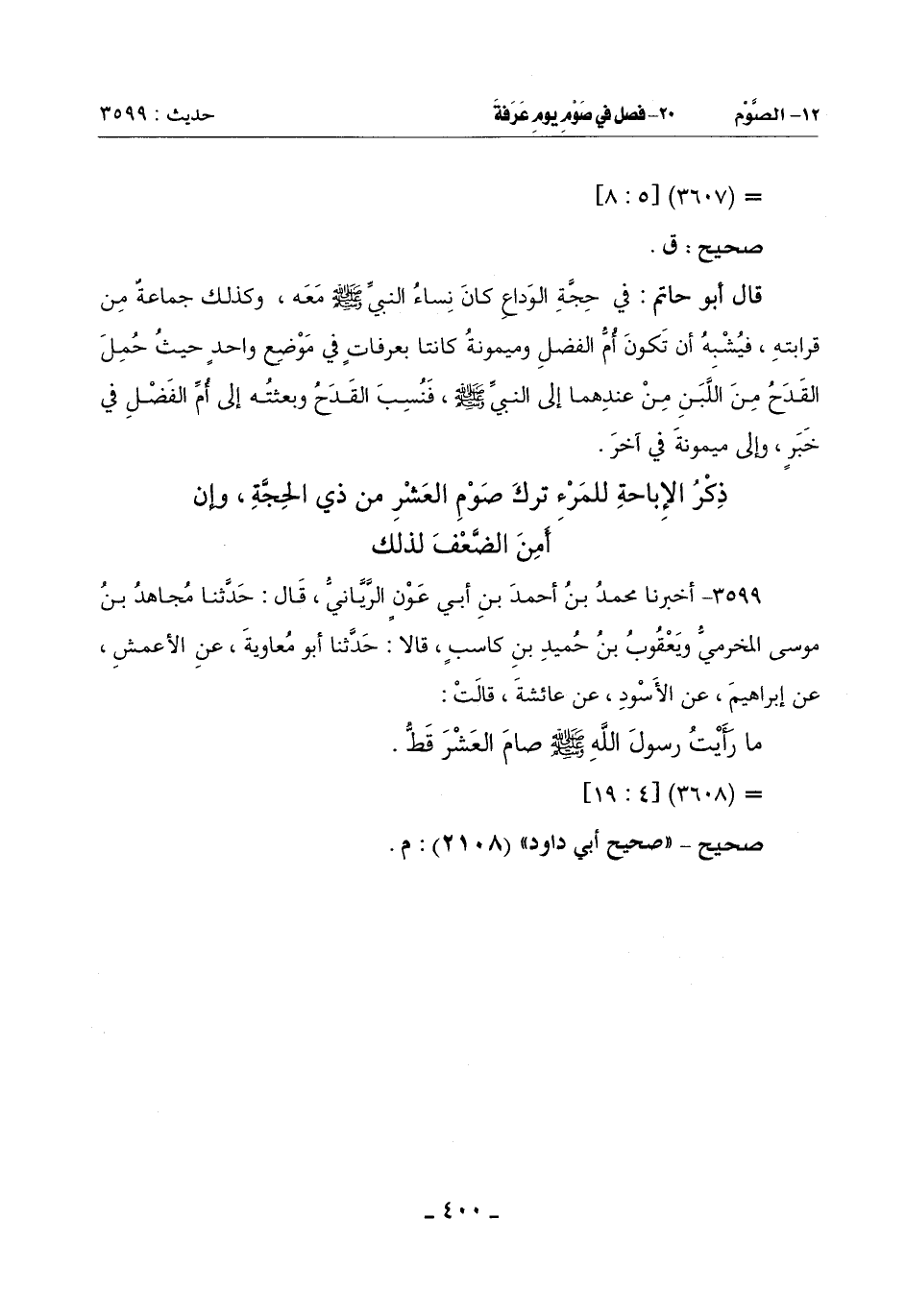 3599 - أَخْبَرَنَا مُحَمَّدُ بْنُ أَحْمَدَ بْنِ أَبِي عَوْنٍ الرَّيَّانِيُّ قَالَ: حَدَّثَنَا مُجَاهِدُ بْنُ مُوسَى الْمُخَرِّمِيُّ وَيَعْقُوبُ بْنُ حُمَيْدِ بْنِ كَاسِبٍ قَالَا: حَدَّثَنَا أَبُو مُعَاوِيَةَ عَنِ الْأَعْمَشِ عَنْ إِبْرَاهِيمَ عَنِ الْأَسْوَدِ عَنْ عَائِشَةَ قَالَتْ: