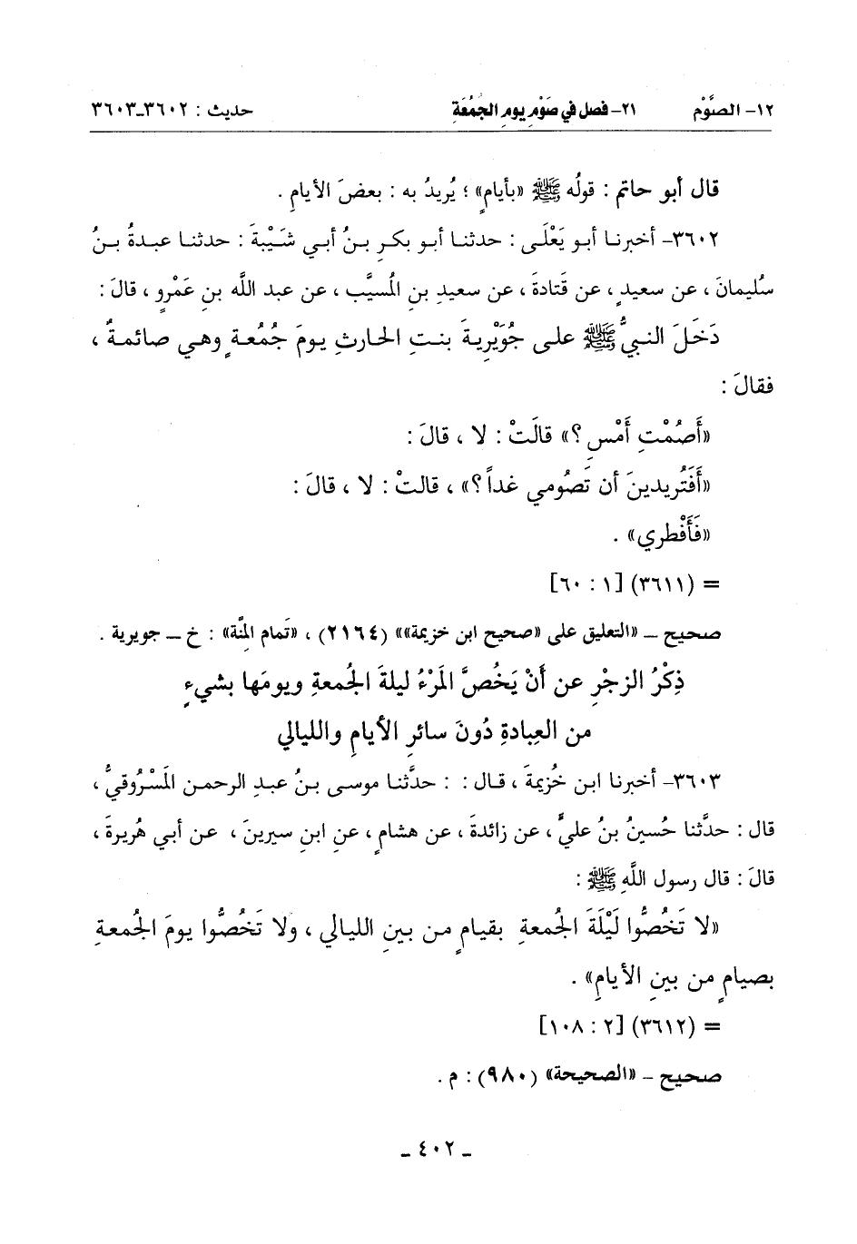 ذِكْرُ الزَّجْرِ عَنْ أَنْ يخصَّ الْمَرْءُ لَيْلَةَ الْجُمُعَةِ وَيَوْمَهَا بِشَيْءٍ مِنَ الْعِبَادَةِ دُونَ سَائِرِ الأيام والليالي