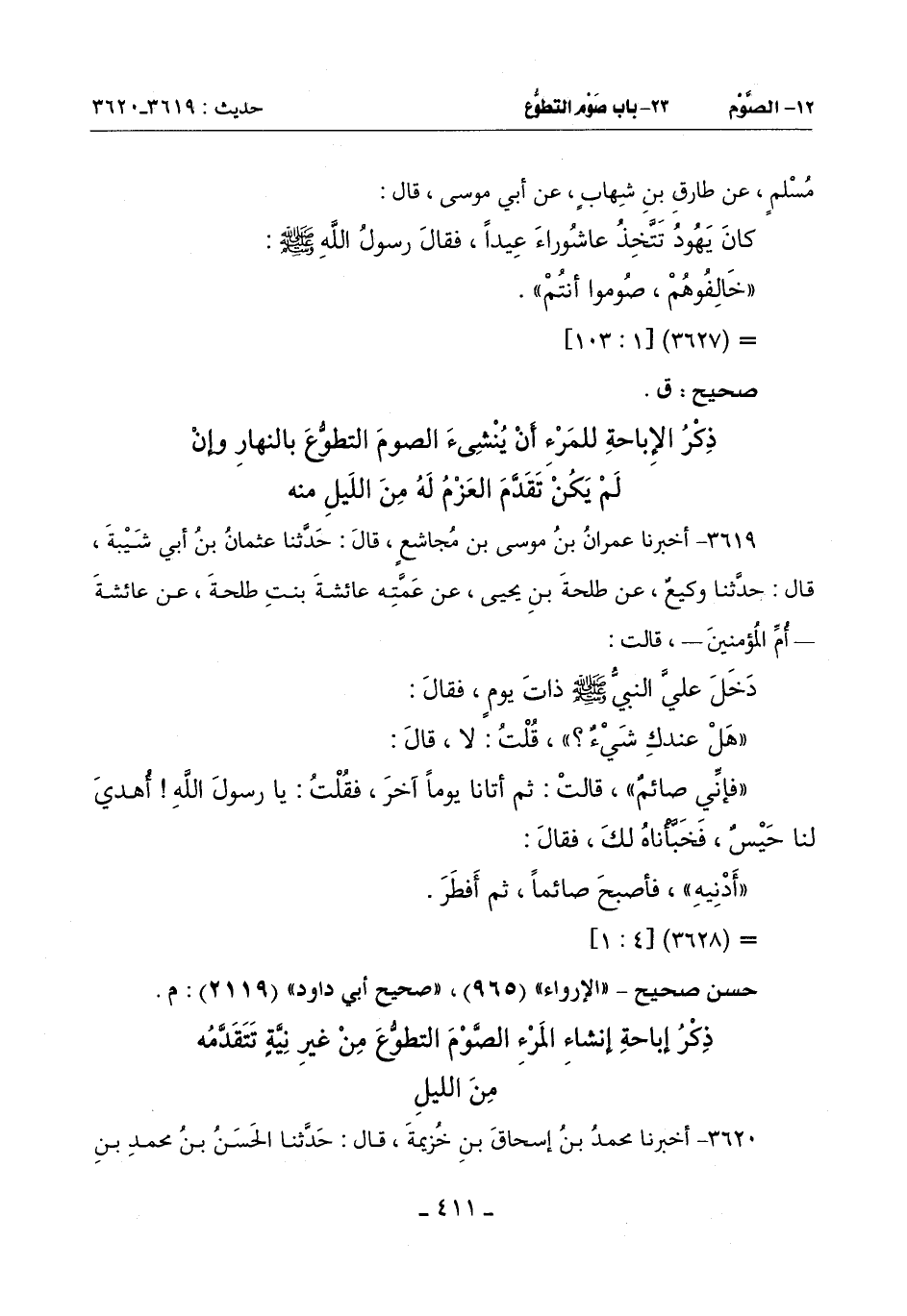 3620 - أَخْبَرَنَا مُحَمَّدُ بْنُ إِسْحَاقَ بْنِ خُزَيْمَةَ قَالَ: حَدَّثَنَا الْحَسَنُ بْنُ مُحَمَّدِ بْنِ -[412]- الصَّبَّاحِ قَالَ: حَدَّثَنَا رَوْحُ بْنُ عُبَادَةَ قَالَ: حَدَّثَنَا شُعْبَةُ عَنْ طَلْحَةَ بْنِ يَحْيَى عَنْ عَائِشَةَ بِنْتِ طَلْحَةَ عَنْ عَائِشَةَ قَالَتْ:
