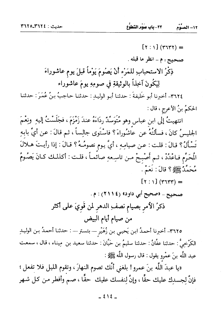 (يَا عَبْدَ اللَّهِ بْنَ عَمْرٍو! بَلَغَنِي أنَّك تَصُومُ النَّهَارَ , وَتَقُومُ اللَّيْلَ فَلَا تَفْعَلْ؛ فَإِنَّ لِجَسَدِكَ عَلَيْكَ حَقًّا , وَإِنَّ لِنَفْسِكَ عَلَيْكَ حَقًّا , صُمْ وَأَفْطِرْ مِنْ كُلِّ شَهْرٍ -[415]- ثَلَاثَةَ أَيَّامٍ صَوْمُ الدَّهْرِ) , قَالَ: قُلْتُ يَا رَسُولَ اللَّهِ! إنِّي أَجِدُ قوَّةً , قَالَ:
