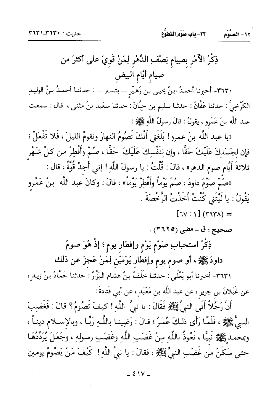 أَنَّ رَجُلًا أَتَى النَّبِيَّ صَلَّى اللَّهُ عَلَيْهِ وَسَلَّمَ فَقَالَ: يَا نَبِيَّ اللَّهِ كَيْفَ تَصُومُ؟ قَالَ: فَغَضِبَ النَّبِيُّ صَلَّى اللَّهُ عَلَيْهِ وَسَلَّمَ فَلَمَّا رَأَى ذَلِكَ عُمَرُ قَالَ: رَضِينَا بِاللَّهِ رَبًّا وَبِالْإِسْلَامِ دِينًا وَبِمُحَمَّدٍ صَلَّى اللَّهُ عَلَيْهِ وَسَلَّمَ نَبِيًّا نَعُوذُ بِاللَّهِ مِنْ غَضِبِ اللَّهِ وَغَضِبِ رَسُولِهِ وَجَعَلَ يردُّدها حَتَّى سَكَنَ مِنْ غَضِبِ النَّبِيِّ صَلَّى اللَّهُ عَلَيْهِ وَسَلَّمَ فَقَالَ: يَا نَبِيَّ اللَّهِ كَيْفَ مَنْ يَصُومُ يَوْمَيْنِ -[418]- وَيُفْطِرُ يَوْمًا؟ قَالَ: