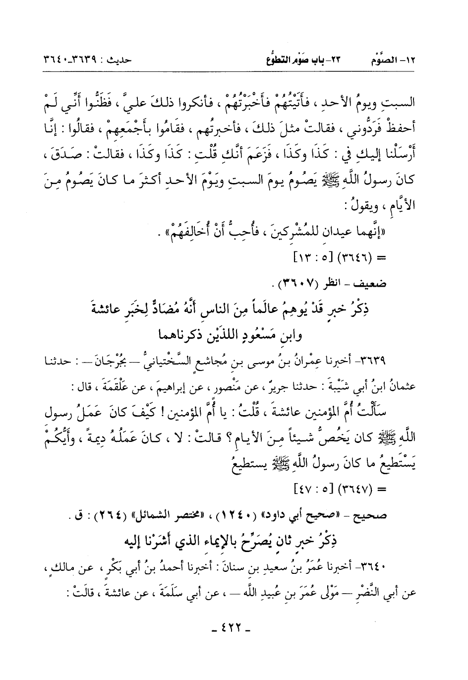 3640 - أَخْبَرَنَا عُمَرُ بْنُ سَعِيدِ بْنِ سِنَانٍ أَخْبَرَنَا أحمد بن أبي بكر عن مالك عن أَبِي النَّضْرِ مَوْلَى عُمَرَ بْنِ عُبَيْدِ اللَّهِ عَنْ أَبِي سَلَمَةَ عَنْ عَائِشَةَ قَالَتْ: -[423]-