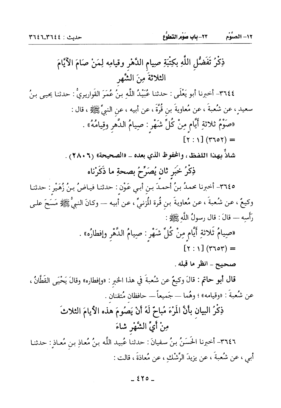 قَالَ أَبُو حَاتِمٍ: قَالَ وَكِيعٌ عَنْ شُعْبَةَ فِي هَذَا الْخَبَرِ: (وَإِفْطَارُهُ) وَقَالَ يَحْيَى الْقَطَّانُ عَنْ شُعْبَةَ: (وَقِيَامُهُ) وَهُمَا جَمِيعًا حَافِظَانِ مُتْقِنَانِ