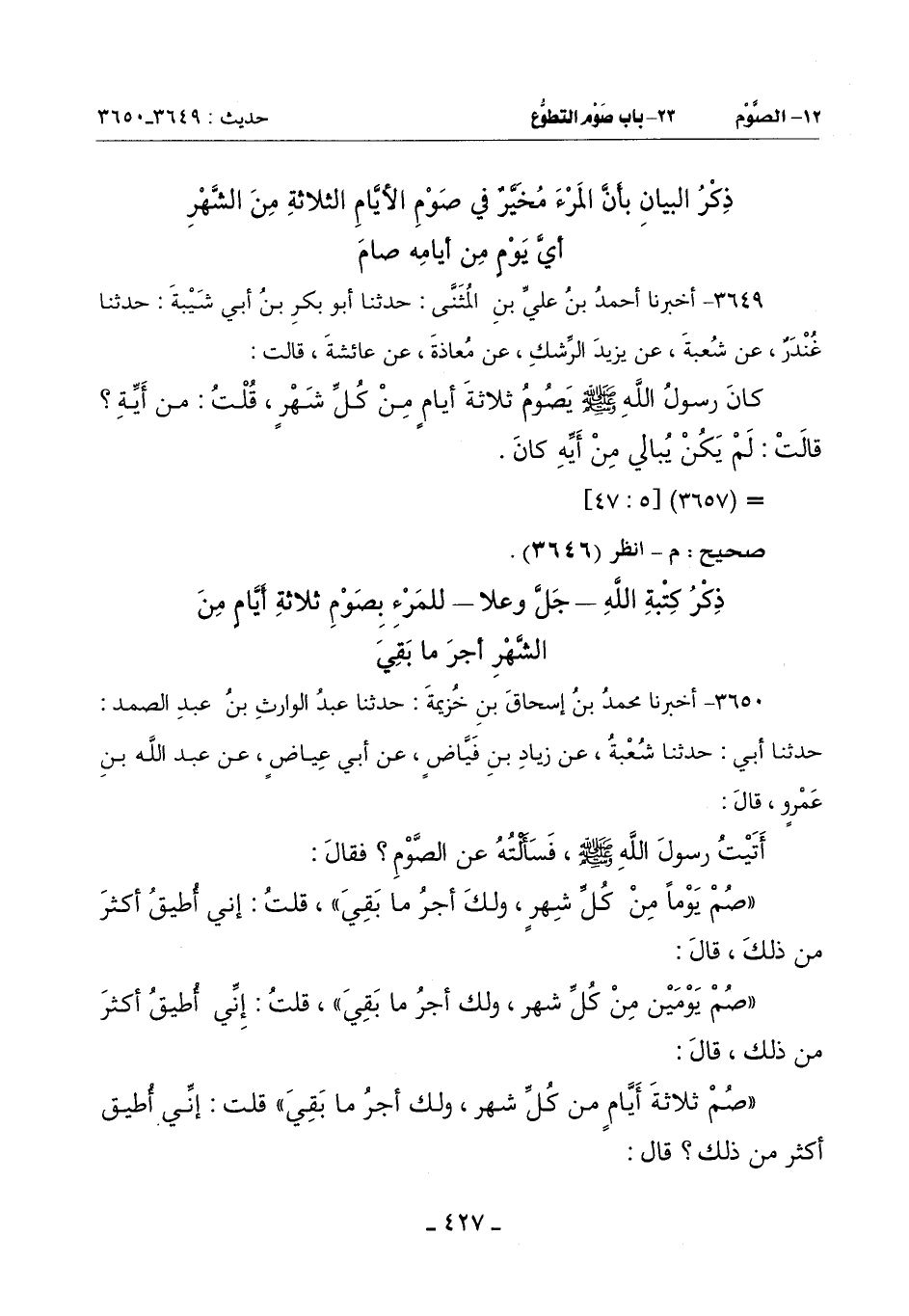 قَالَ أَبُو حَاتِمٍ: قَوْلُهُ صَلَّى اللَّهُ عَلَيْهِ وَسَلَّمَ: (صُمْ يَوْمًا مِنْ كُلِّ شَهْرٍ وَلَكَ أَجْرُ مَا بَقِيَ) يُرِيدُ أَجْرَ مَا بَقِيَ مِنَ الْعِشْرِينِ وَكَذَلِكَ فِي الثَّلَاثِ إِذْ مُحَالٌ أَنَّ كدَّه كُلَّمَا كَثُرَ كَانَ أَنْقُصَ لِأَجْرِهِ (¬1)