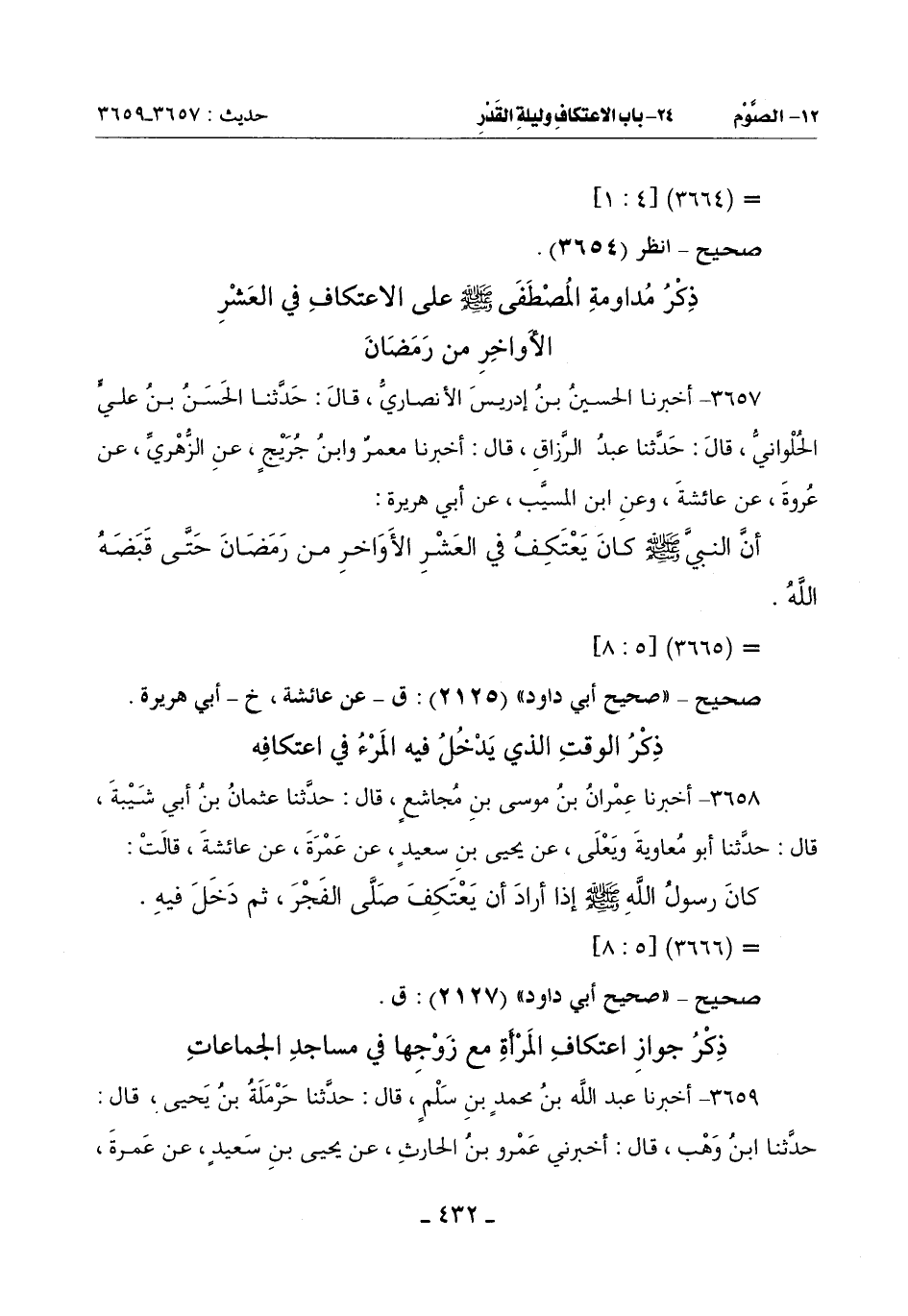 (مَا هَذَا آلبِرَّ تُرِدْنَ بِهَذَا؟ ) فَتَرَكَ الِاعْتِكَافَ حَتَّى أَفْطَرَ مِنْ رَمَضَانَ ثُمَّ إِنَّهُ اعْتَكَفَ فِي عِشْرِينَ من شوال)