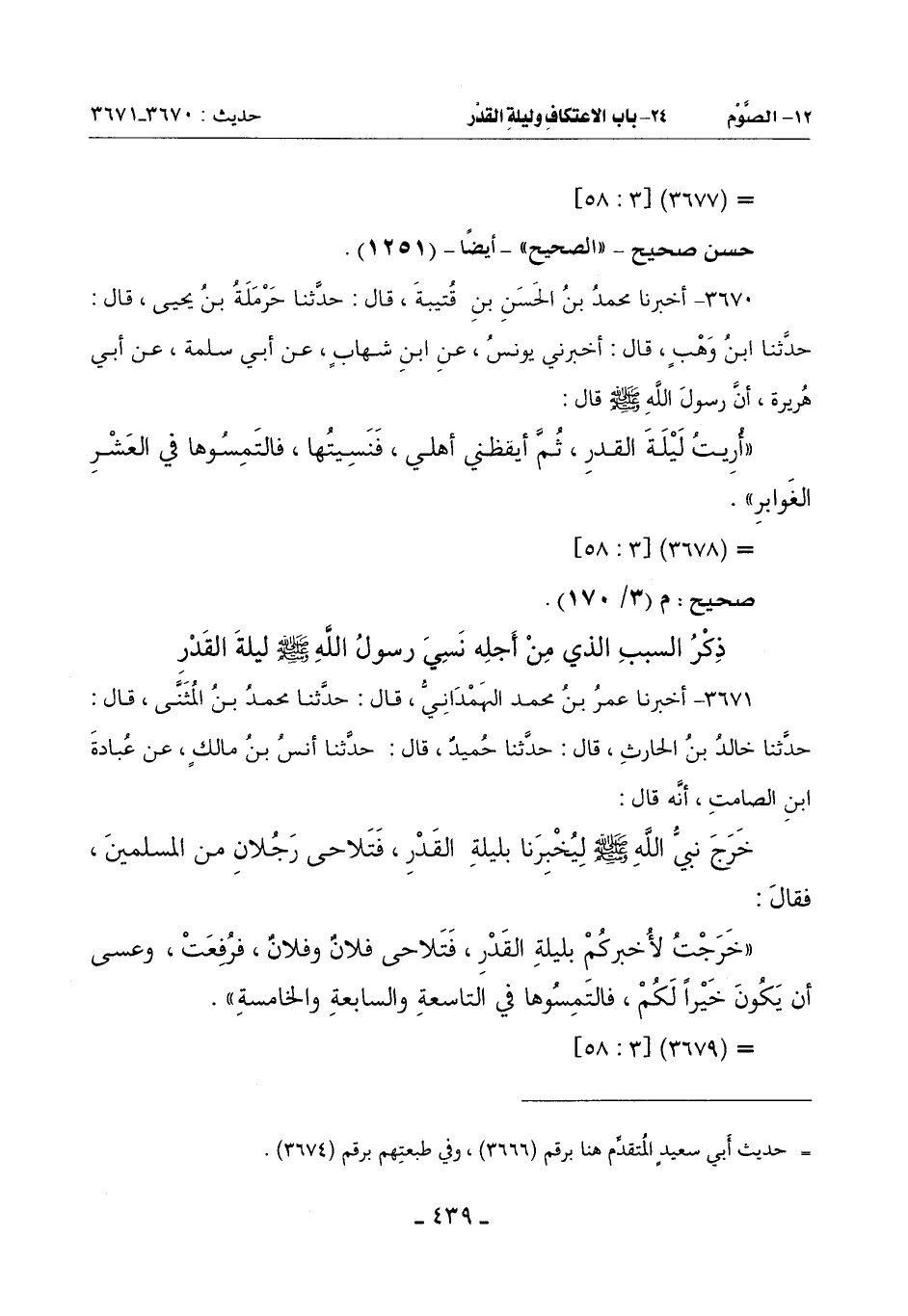 (خَرَجْتُ لِأُخْبِرَكُمْ بِلَيْلَةِ الْقَدْرِ فَتَلَاحَى فُلَانٌ وَفُلَانٌ فرُفِعَتْ وَعَسَى أَنْ يَكُونَ خَيْرًا لكم فالتمسوها في التاسعة والسابعة والخامسة)
