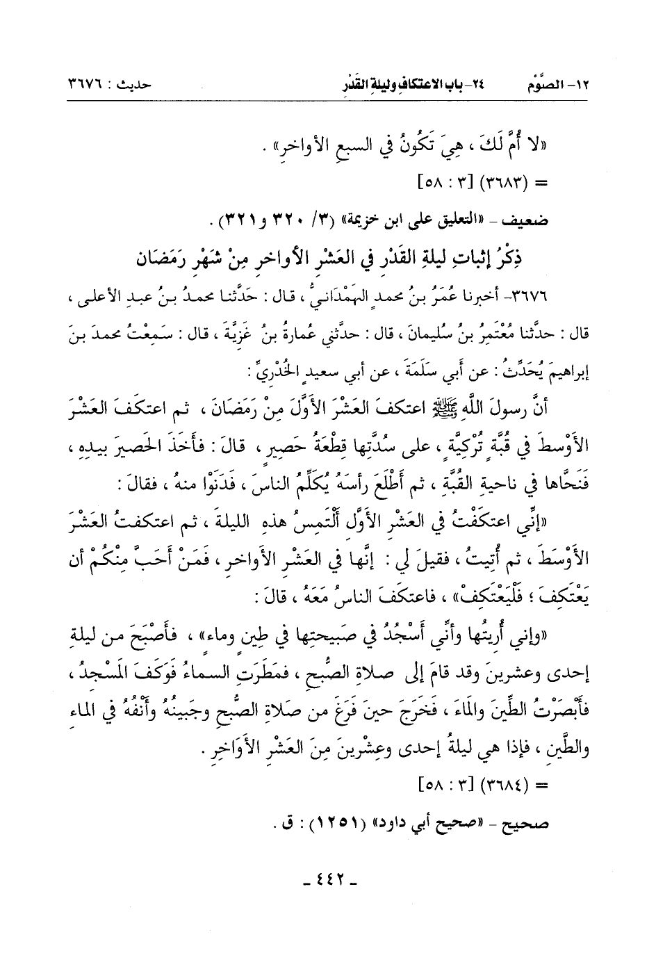 (إِنِّي اعْتَكَفَتُ فِي الْعَشْرِ الْأُوَلِ الْتَمِسُ هَذِهِ اللَّيْلَةَ ثُمَّ اعْتَكَفْتُ الْعَشْرَ الْأَوْسَطَ ثُمَّ أُتِيتُ فَقِيلَ لِي: إِنَّهَا فِي الْعَشْرِ الْأَوَاخِرِ فَمَنْ أَحَبَّ مِنْكُمْ أَنْ يَعْتَكِفَ فَلْيَعْتَكِفْ) فَاعْتَكَفَ النَّاسُ مَعَهُ قَالَ: