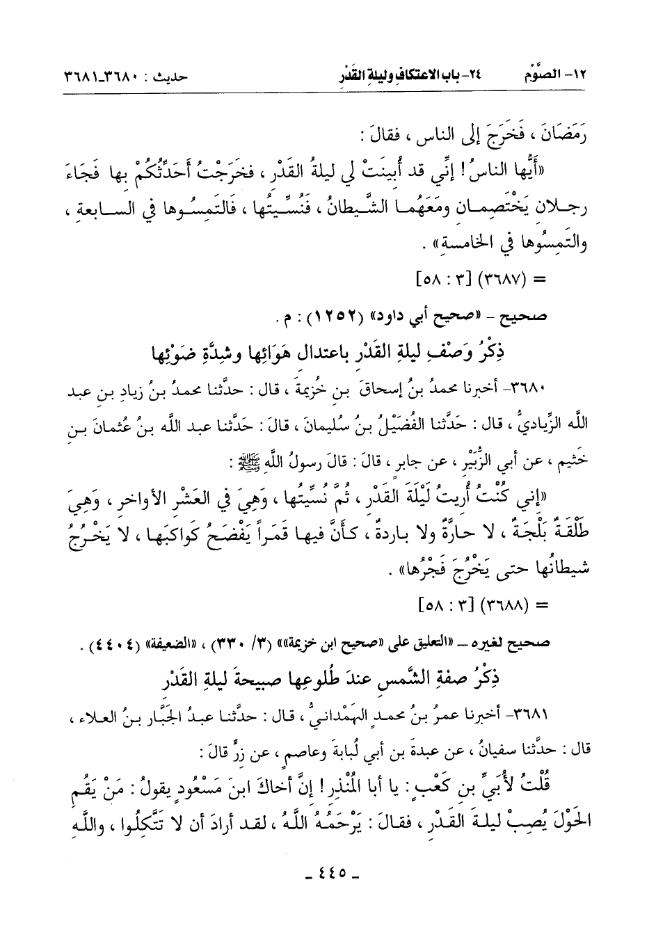 (إِنِّي كُنْتُ أُرِيتُ لَيْلَةَ الْقَدْرِ ثُمَّ نُسِّيتُها وَهِيَ فِي الْعَشْرِ الْأَوَاخِرِ وَهِيَ طَلْقَةٌ بَلْجَةٌ لَا حَارَّةٌ وَلَا بَارِدَةٌ كَأَنَّ فِيهَا قَمَرًا يَفْضَحُ كَوَاكِبَهَا لَا يَخْرُجُ شَيْطَانُهَا حَتَّى يَخْرُجَ فجرها)